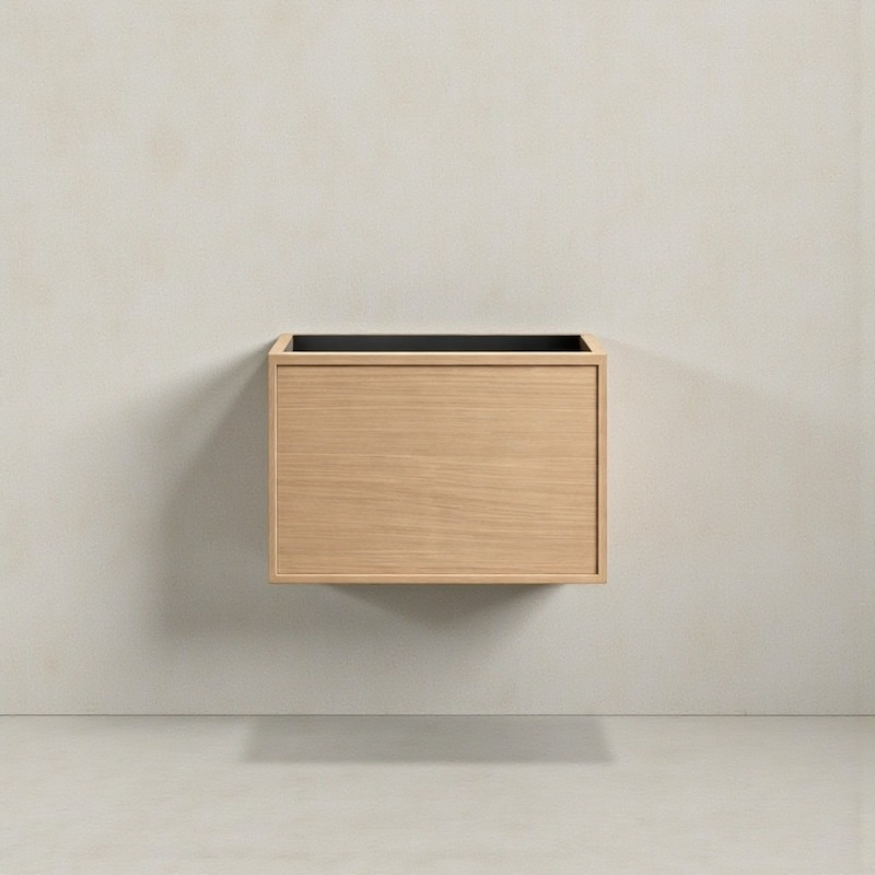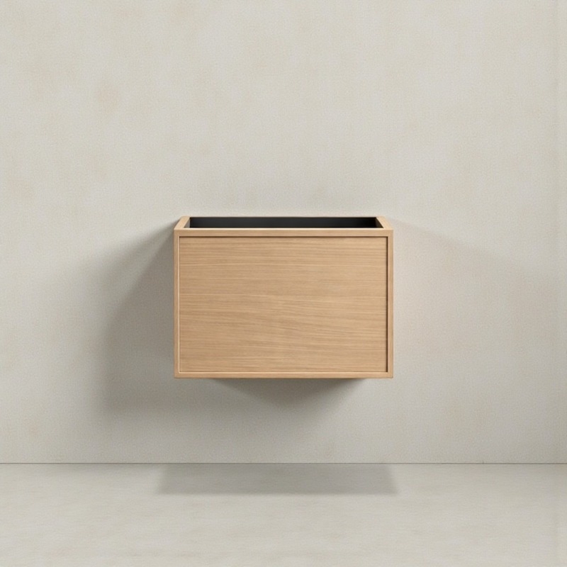 Compact and refined, the Modular 70 cm vanity unit combines a textured smoked sand oak finish, a modern wall-mounted design and practical storage for today's bathrooms.