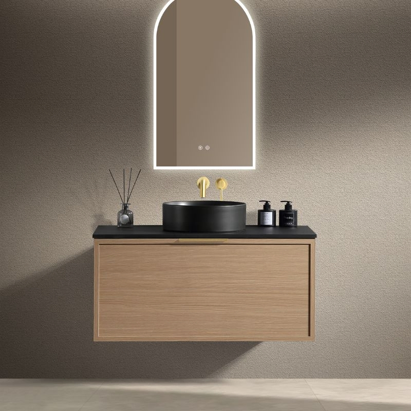 The resin vanity top, supplied undrilled, allows for the installation of one or two countertop basins, with standard or wall-mounted faucets as needed. Drilling is easily done using a hole saw.