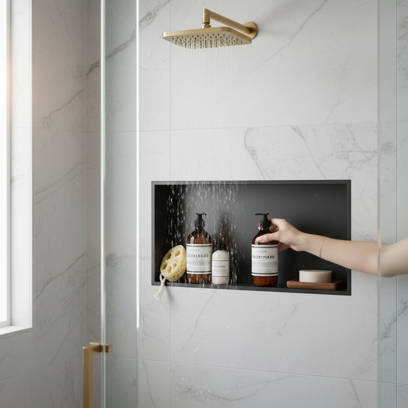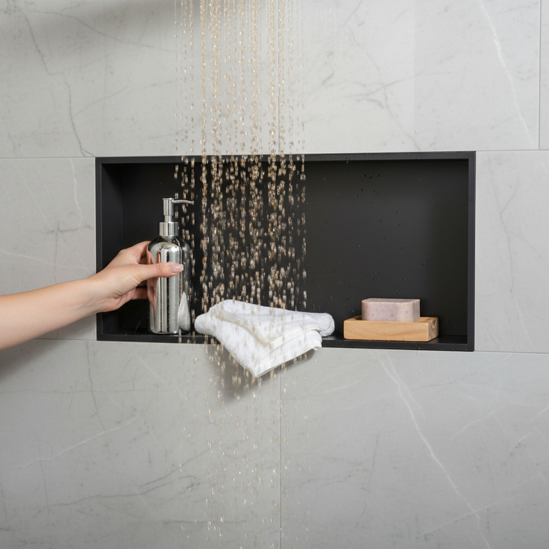 Optimize your wall space during your bathroom renovation by inserting a matte black stainless steel shower niche for a tidier bathroom. The matte black recessed niche is available in two sizes: 30 cm and 60 cm.
