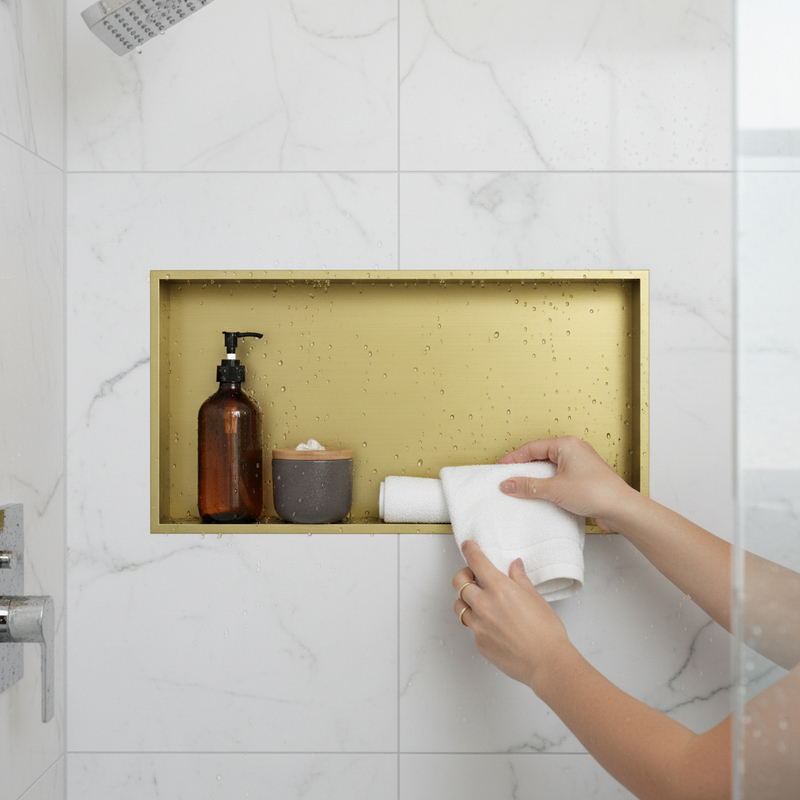 Choosing a brushed gold niche allows you to coordinate it with your faucets or shower enclosure profile. This way, you can create a cohesive bathroom décor without any jarring notes.
