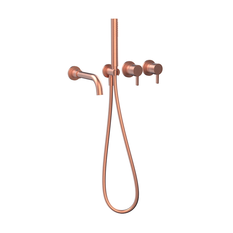 The installation of this wall-mounted bathtub faucet offers great flexibility: you can reverse the order of the bathtub spout and the hand shower, or even position the fourth element (spout or hand shower) on a different wall. These elements do not need to be installed side by side, allowing for a customized configuration.