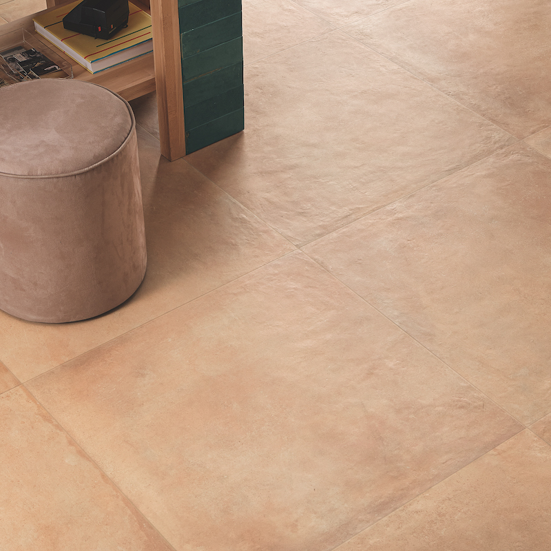 The 80 x 80 cm format, offered in a Silktech finish, sets the tone. Its large tiles create a seamless visual continuity, ideal for open spaces and contemporary interiors. The Silktech surface, soft to the touch yet offering excellent grip, enhances user comfort and quality. With its modernized mineral and cotta hues, this format establishes a refined, luminous, and naturally elegant ambiance.
