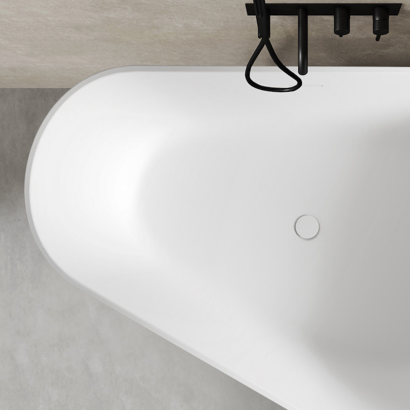 De elegante en tijdloze matte witte kleur is ook terug te vinden in de afvoer en de discrete overloop, geïntegreerd in de vorm van een kleine gleuf.