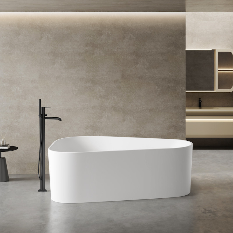 Het vrijstaande bad Asyma Trio, met zijn unieke asymmetrische 3-hoekige ontwerp, combineert esthetiek en comfort voor ontspannende momenten voor twee.