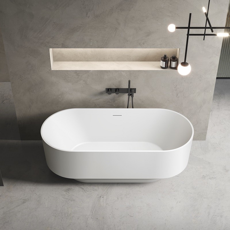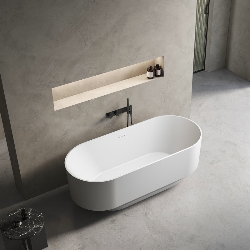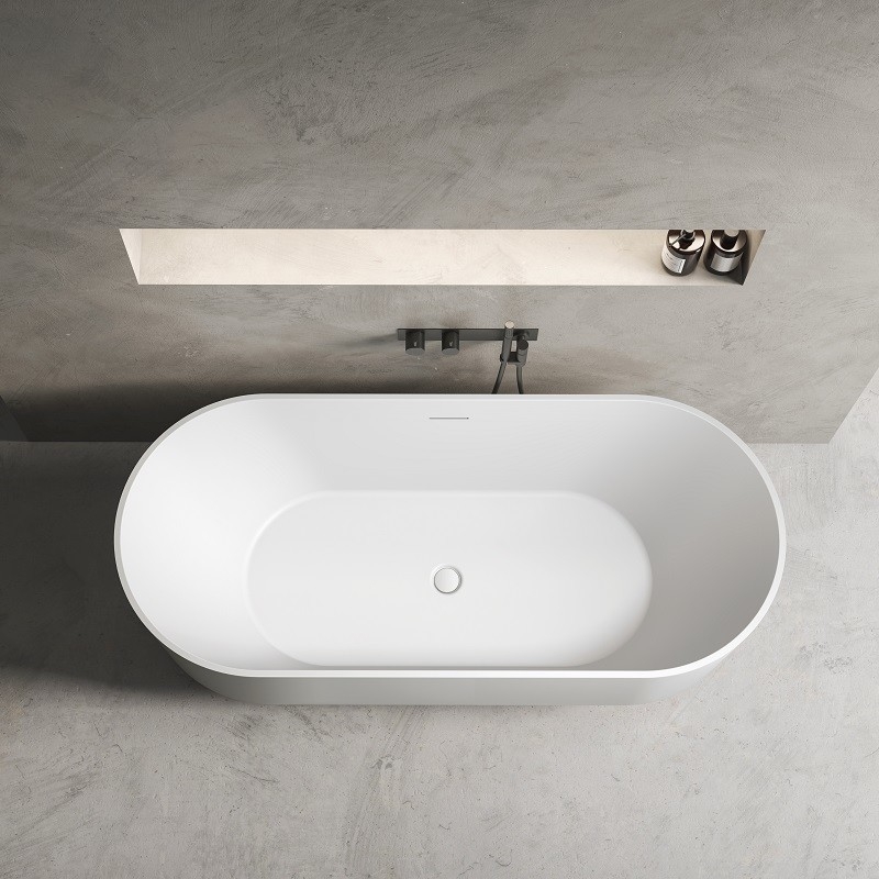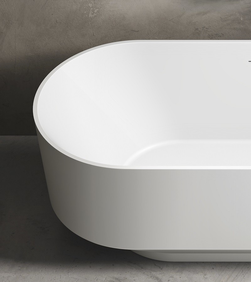 Met een lengte van 170 cm heeft de Liva een ovaal silhouet en rust op een voet die dunner is dan het bad. Hierdoor lijkt het alsof het zweeft en voegt het een vleugje lichtheid toe aan uw badkamerruimte.