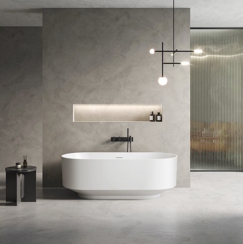 De Liva, een prachtig vrijstaand bad, belichaamt de essentie van elegantie en verfijning in uw badkamer. De matte afwerking geeft dit bad een unieke charme, die doet denken aan de verfijning van massieve oppervlakken.