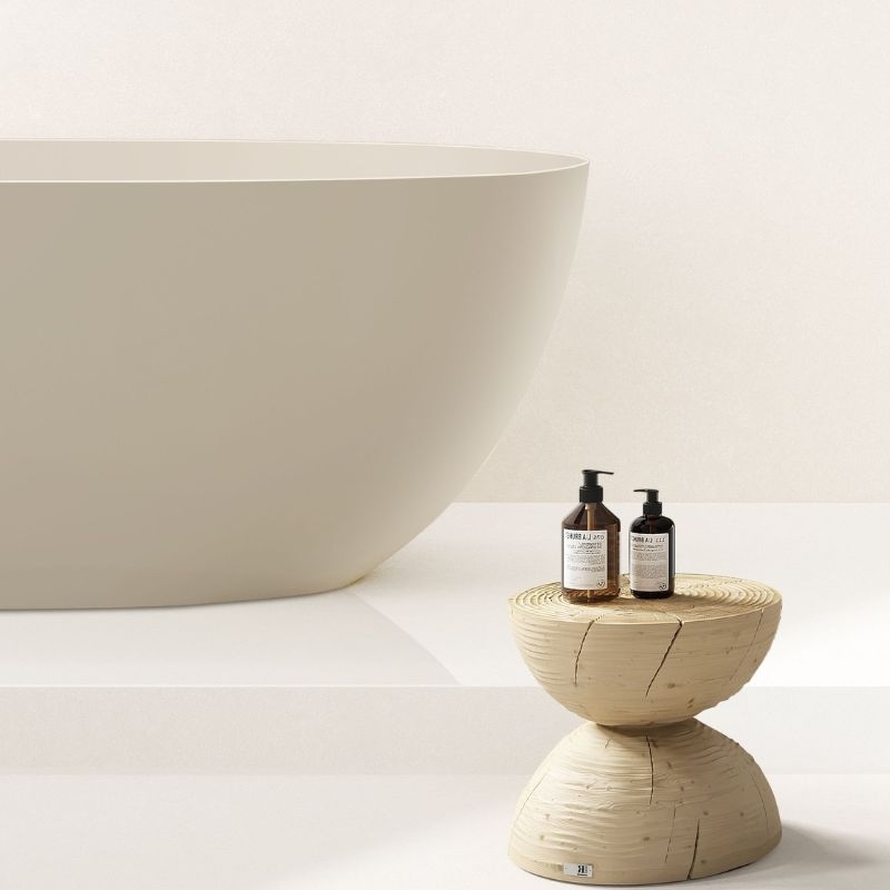 Het vrijstaande bad Dune 160 cm in beige solid surface is geïnspireerd op natuurlijke tinten en vormt een elegant, duurzaam en comfortabel middelpunt, geschikt voor zowel binnen- als buitengebruik.