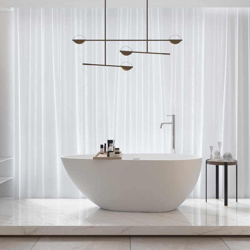 Droom je van een bad dat zowel origineel als praktisch is en naadloos aansluit bij de stijl van je badkamer? Ontdek het ovale vrijstaande bad ELLIPSE in wit solid surface.