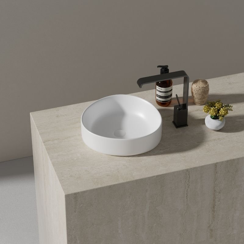Silk is een 41 cm opzetwastafel met een vloeiend en asymmetrisch design. De onregelmatige organische vorm geeft de badkamer een natuurlijke touch. Verkrijgbaar in twee afwerkingen: glanzend en mat.