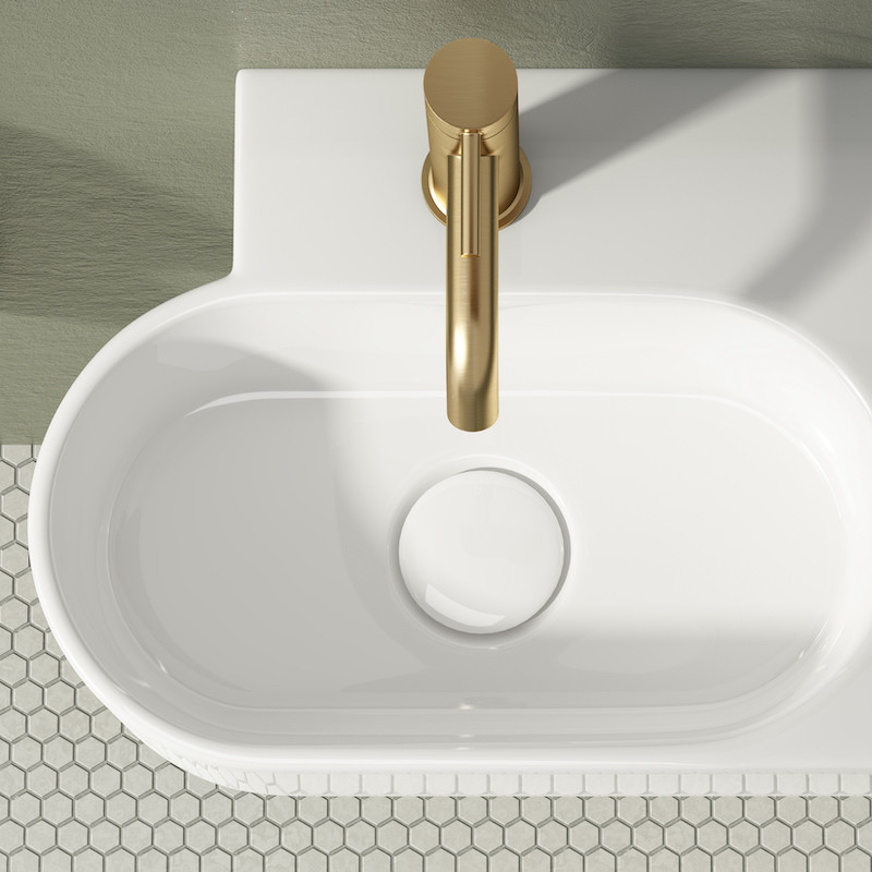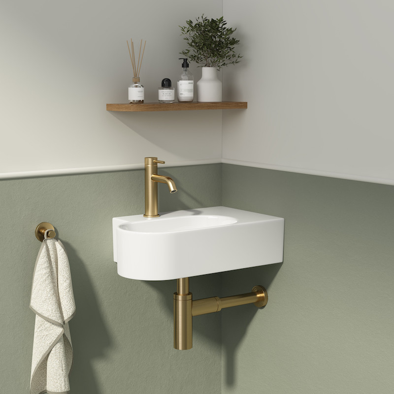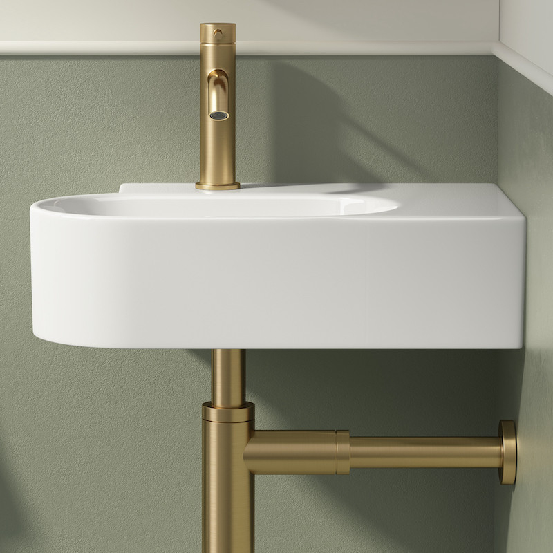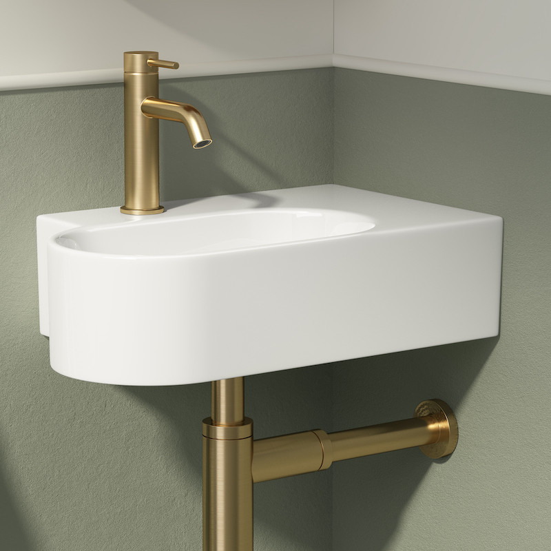 Het strakke, minimalistische ontwerp van de Alcova hoekwastafel past naadloos in een toilet en biedt tegelijkertijd een essentiële ruimtebesparende oplossing voor kleine ruimtes. De Alcova 45 cm wandgemonteerde hoekwastafel is het essentiële waterpunt voor een praktische, functionele en elegante badkamer.