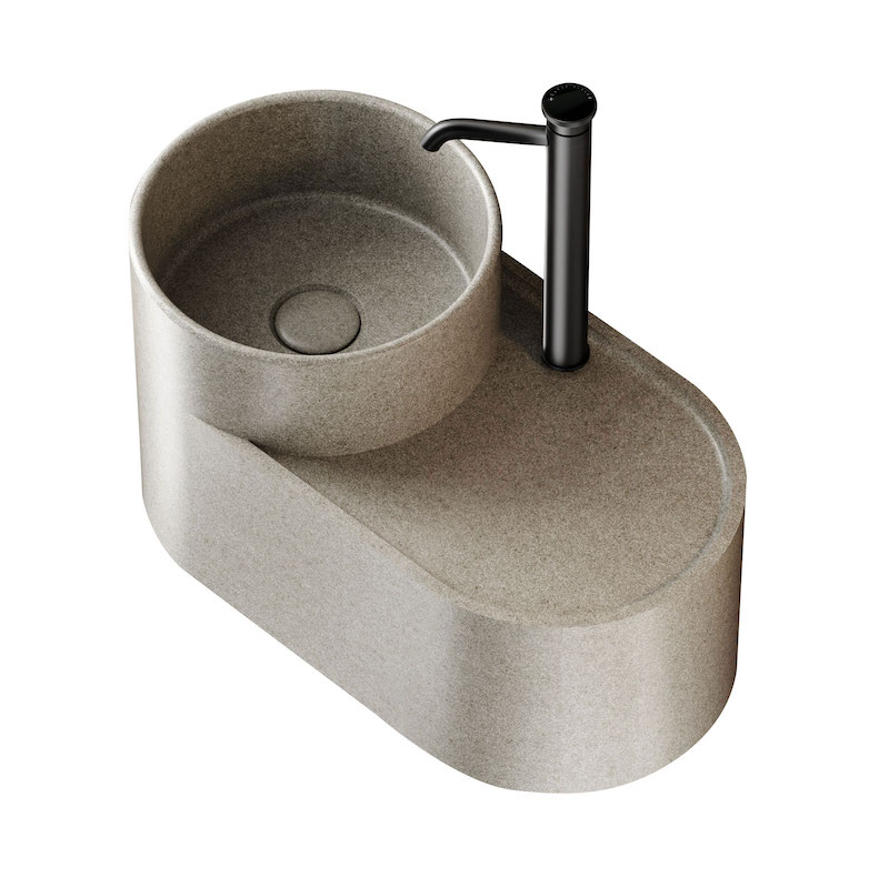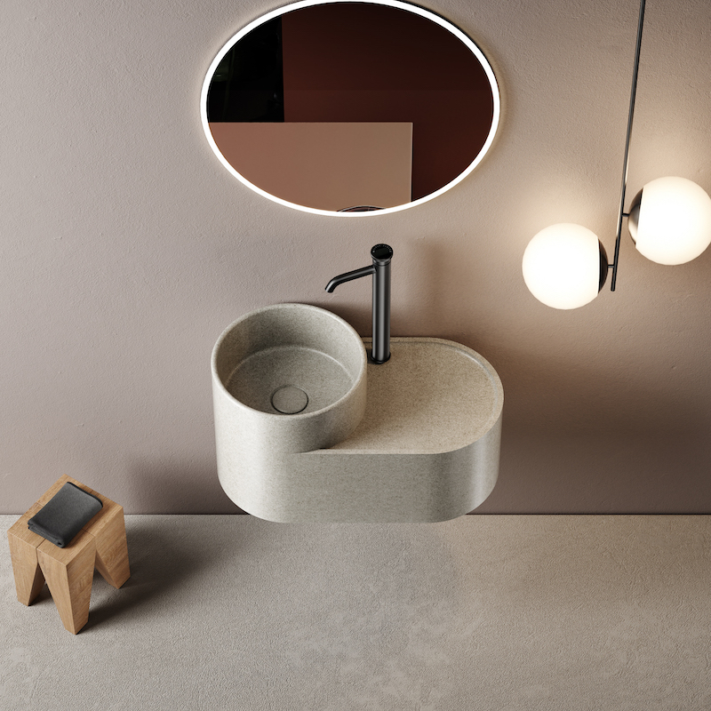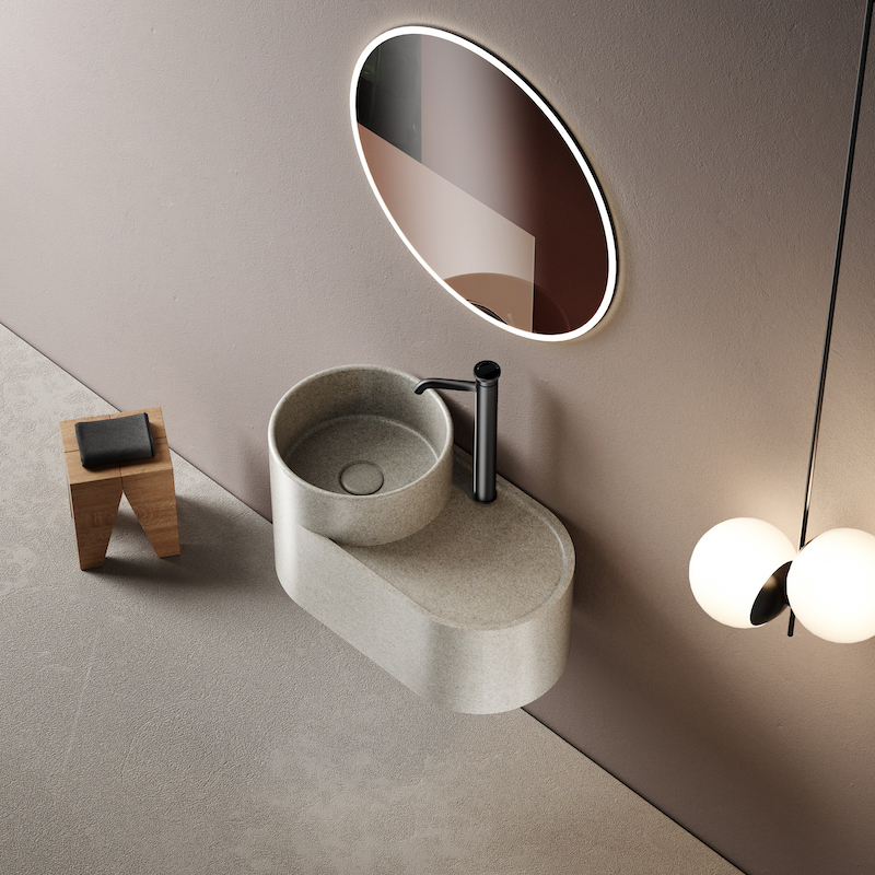 De Halo 50 cm wandwastafel is compact en rond en combineert een zachte esthetiek, een warme mineraalbeige tint en een matte afwerking om kleine ruimtes stijlvol en licht te maken.