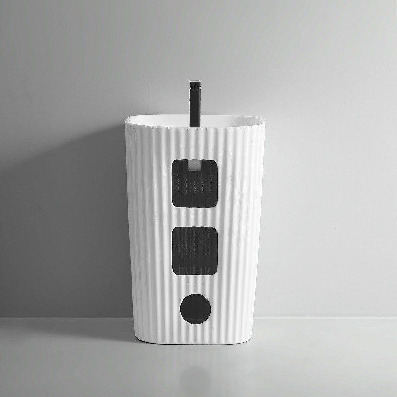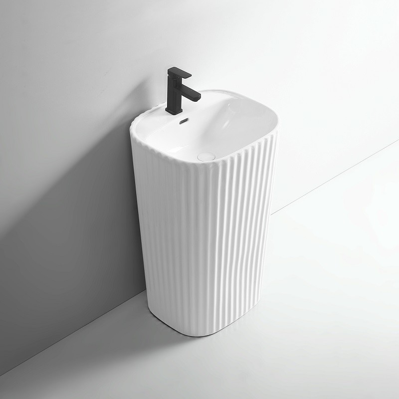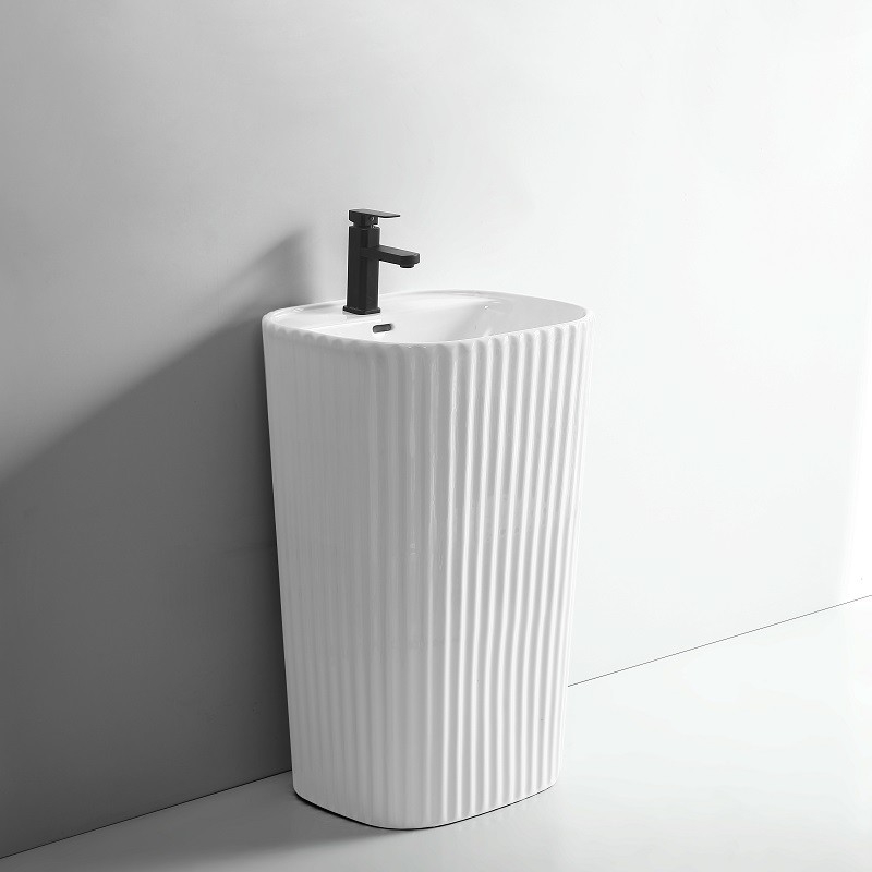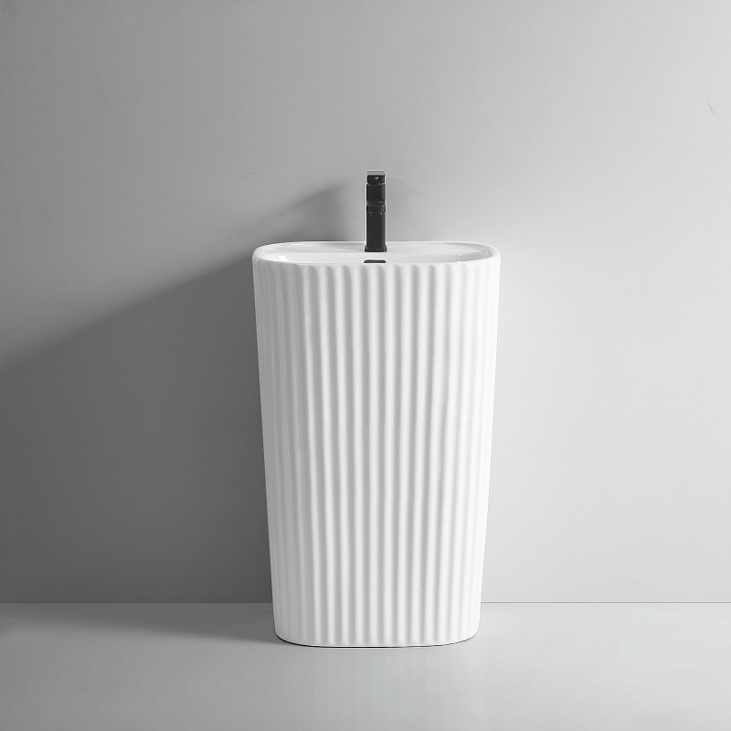 De Wavy voetstukwastafel is een opvallend keramisch stuk met een totemvormig ontwerp, versierd met verhoogde verticale groeven, dat een moderne en elegante toets geeft aan elke badkamer, toilet of hoofdslaapkamer.