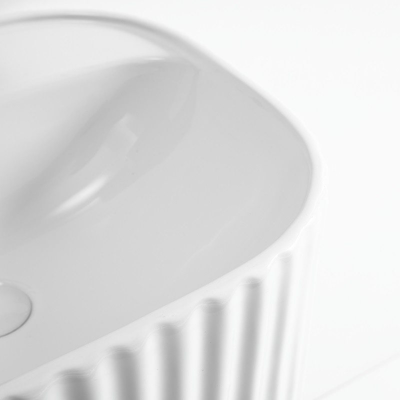 Vanuit interieurontwerpperspectief zijn verticale cannelures een zeer trendy element dat textuur en dynamiek aan de ruimte toevoegt. Het artistieke ontwerp en de glanzend witte keramische afwerking brengen helderheid in de kamer.