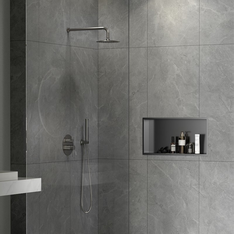 Breng een vleugje moderniteit en functionaliteit in uw badkamer of douche met onze ingebouwde opbergnissen. Ze zijn verkrijgbaar in een elegante metaalkleur.