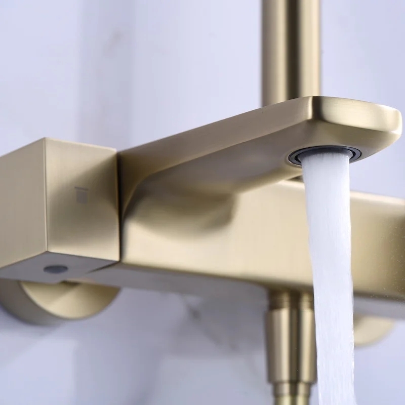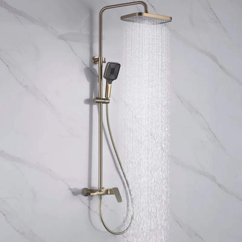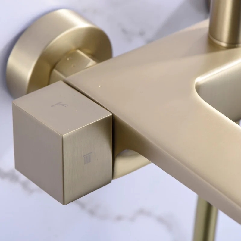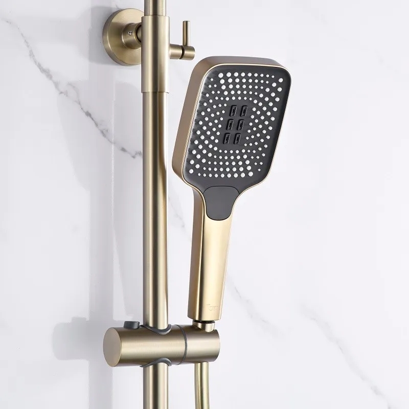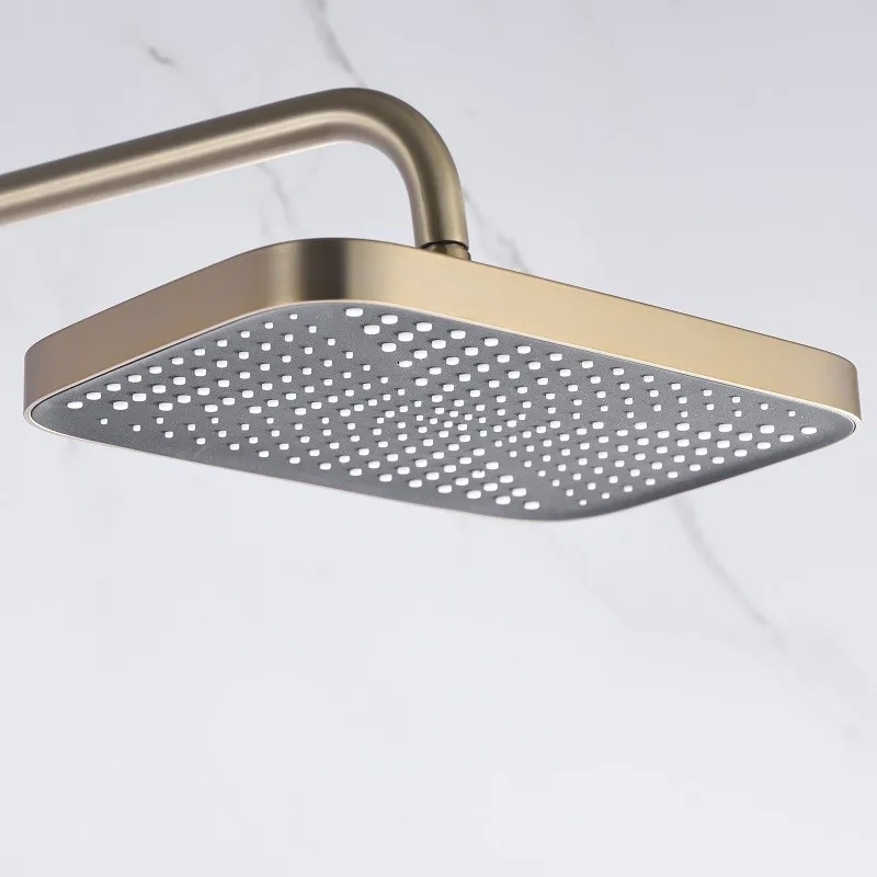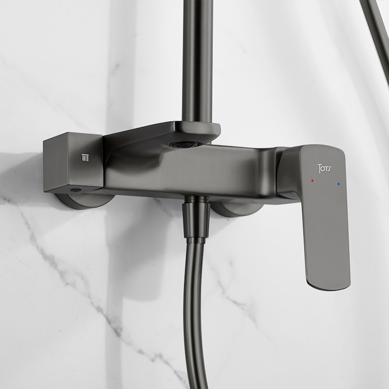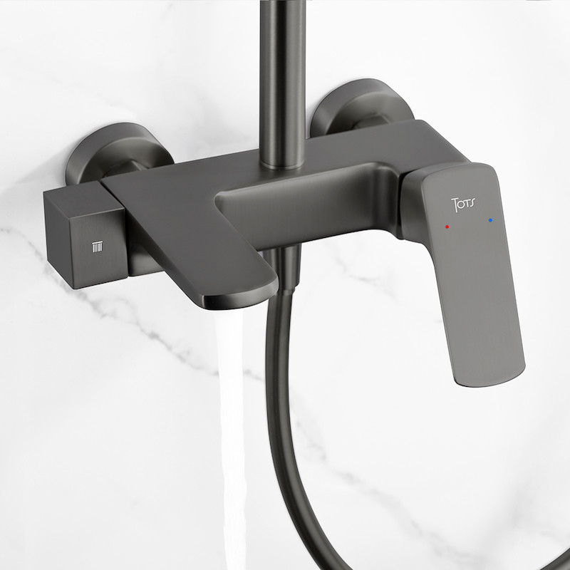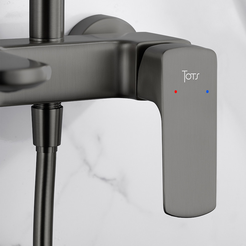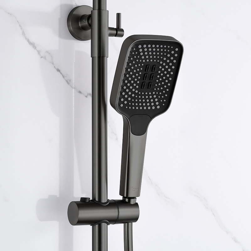 Transformeer uw badkuip in een douche met de One Gun Metal en Brushed Gold bad-douchekolom, een elegante en functionele 3-in-1-oplossing met een baduitloop, een royale regendouchekop en een handdouche met verstelbare stralen voor ultiem comfort.