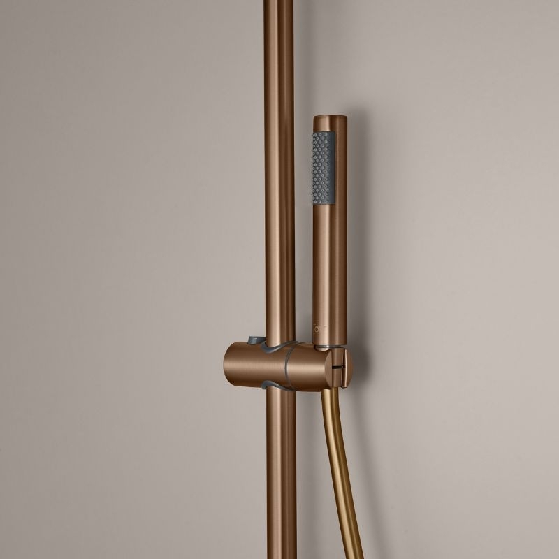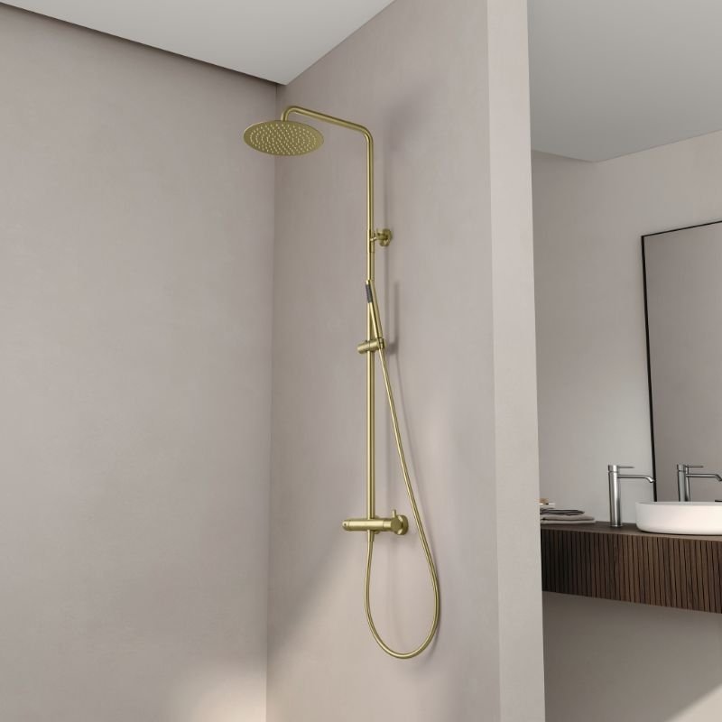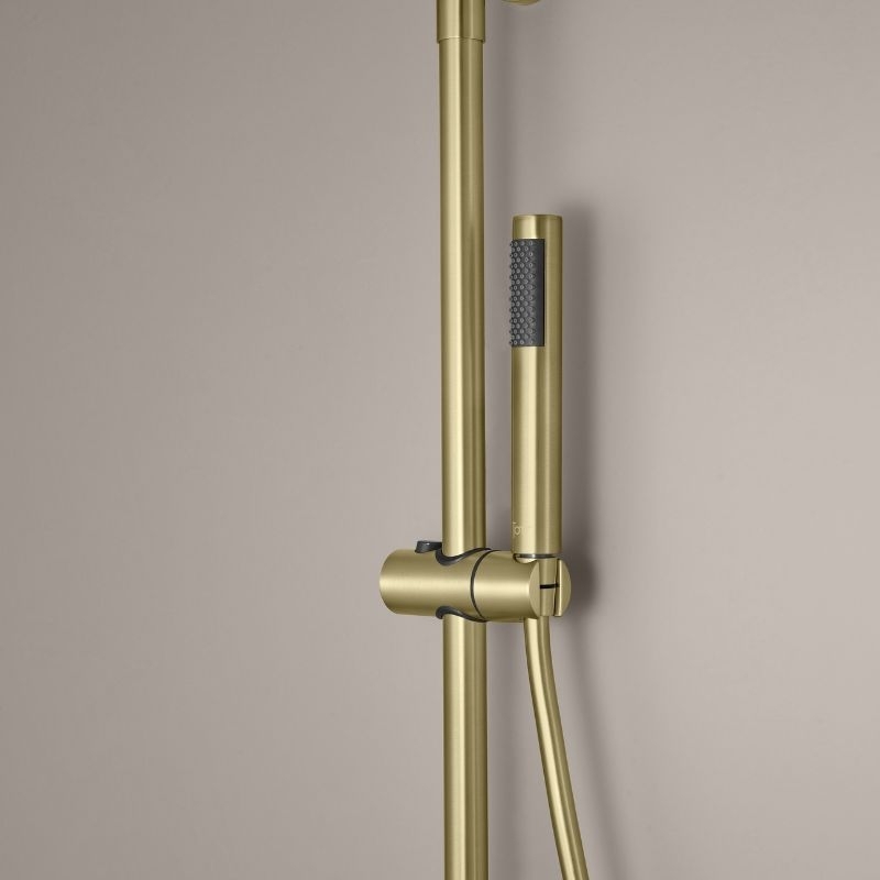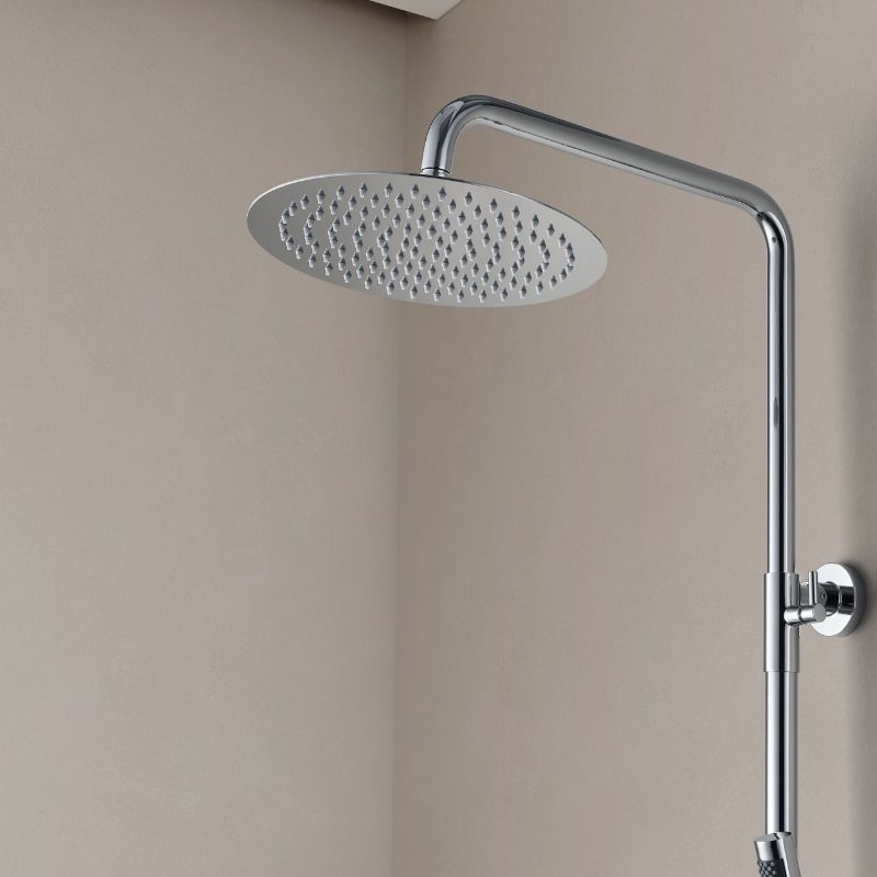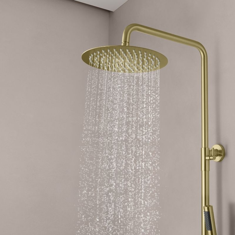 De kolom bestaat uit een 25 cm smalle douchekop van roestvrij staal, een cilindrische handdouche van messing, een 150 cm lange PVC-slang met anti-twist-functie en een in hoogte verstelbare constructie van 100 tot 160 cm.
