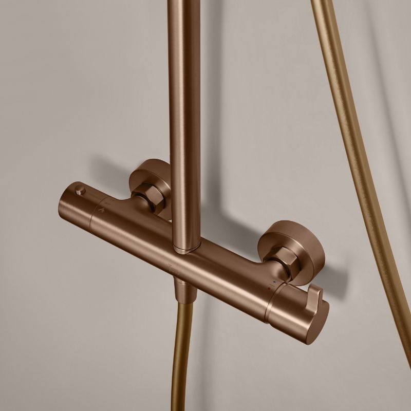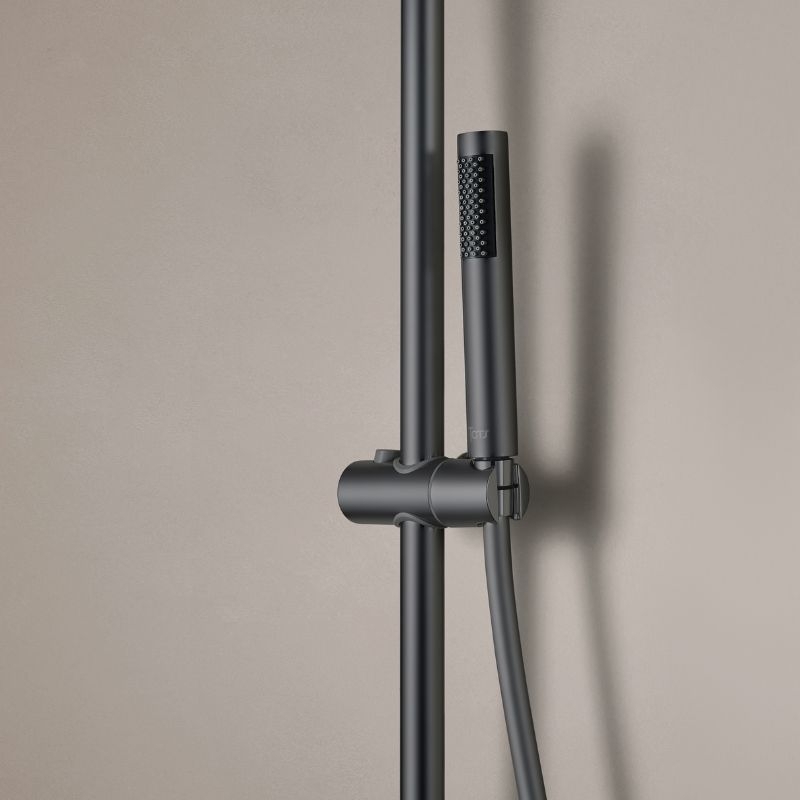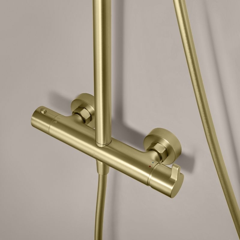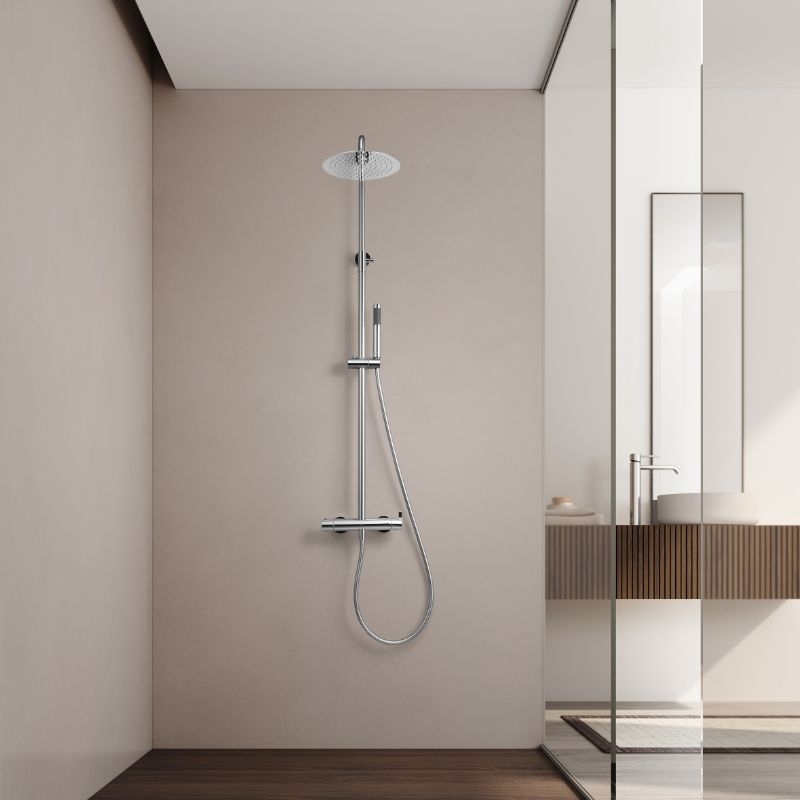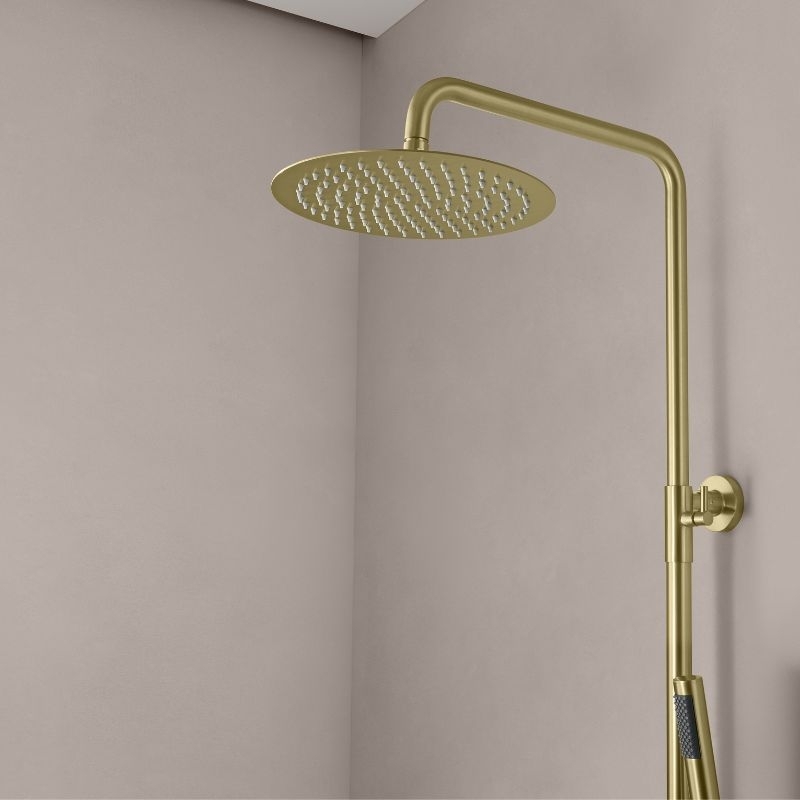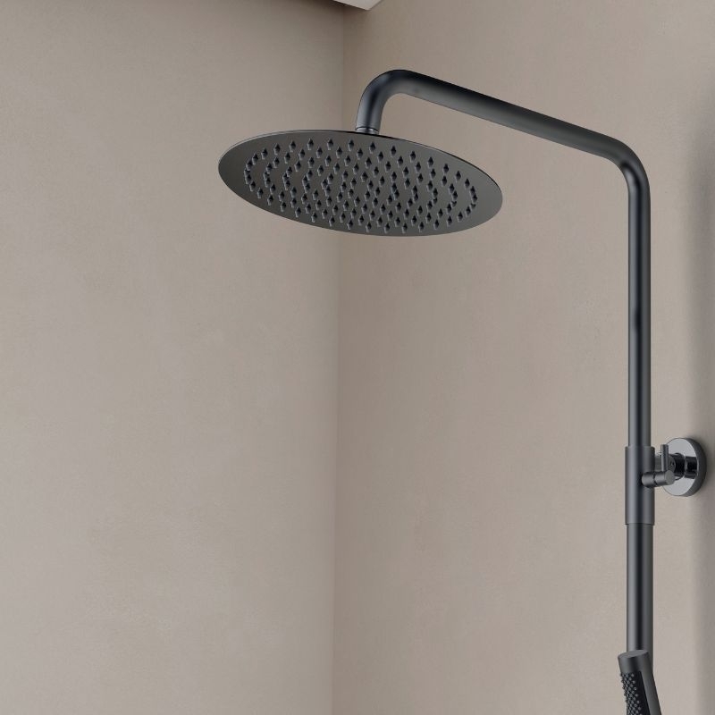 De kolom bestaat uit een 25 cm smalle douchekop van roestvrij staal, een cilindrische handdouche van messing, een 150 cm lange PVC-slang met anti-twist-functie en een in hoogte verstelbare constructie van 100 tot 160 cm.
