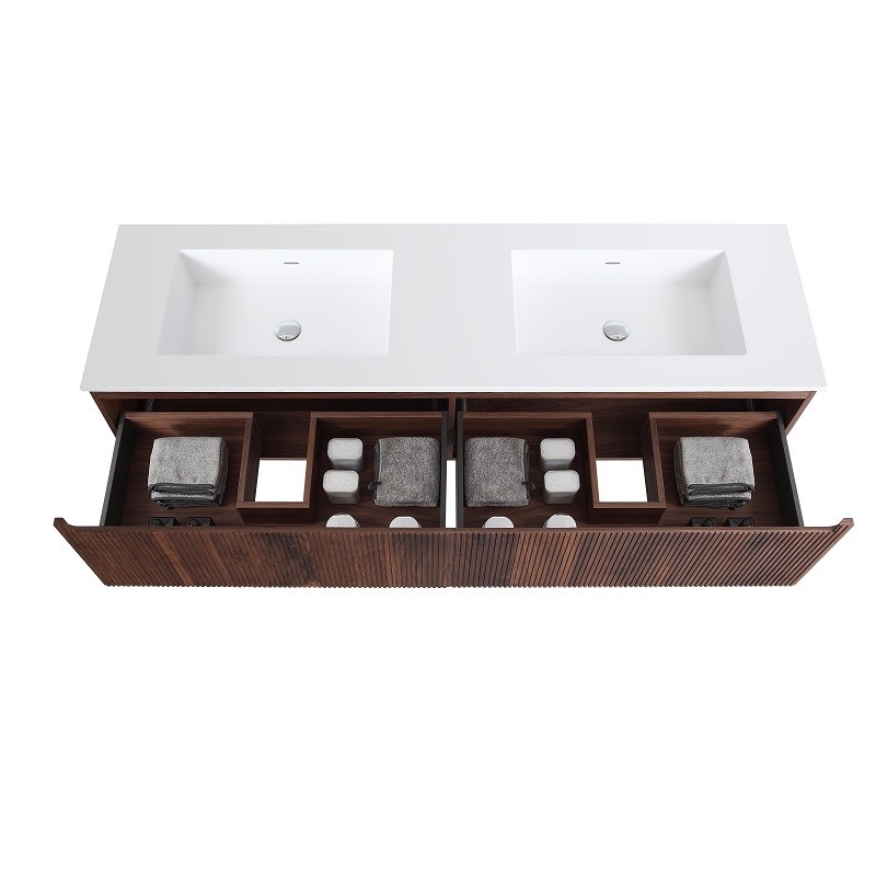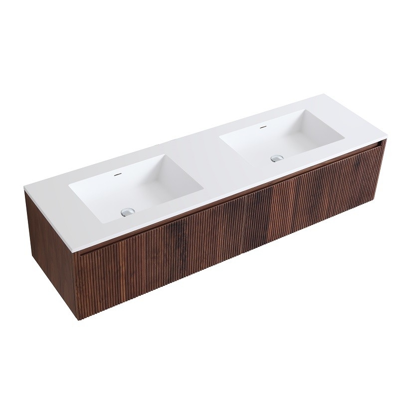 Ontdek de verfijning van walnotenhout met ons Tosca wandgemonteerde badkamermeubel met dubbele wastafel. De nobelheid van walnotenhout brengt tijdloze elegantie in uw badkamer en past perfect bij elke woonstijl. De uitzonderlijke slijtvastheid maakt het een verstandige keuze voor vochtige ruimtes zoals de badkamer.