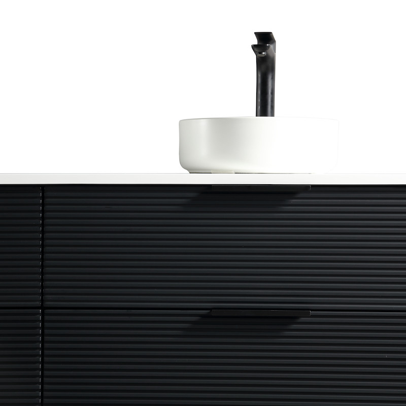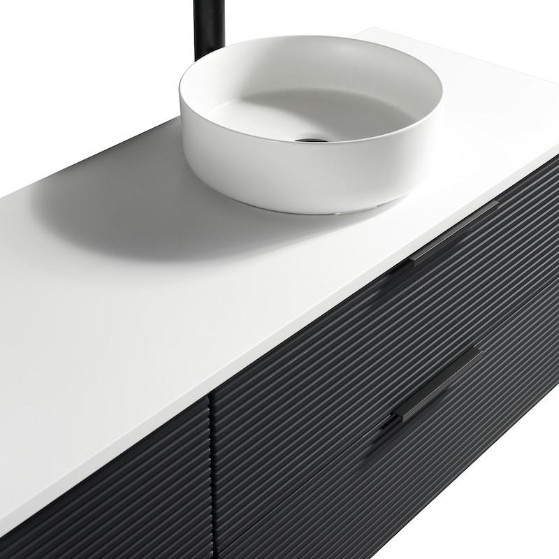 Het matte harsblad, uitzonderlijk dun met slechts 15 mm, voegt een vleugje moderniteit toe. De opzetwastafel is niet inbegrepen, zodat u de stijl kunt kiezen die bij u past.