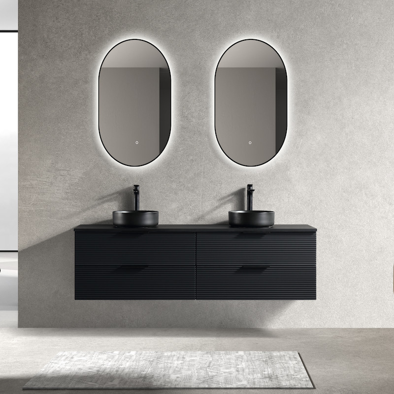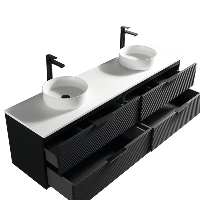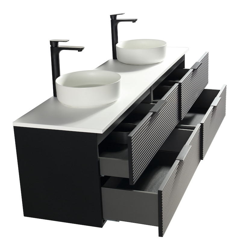 De Rigato-unit biedt daarnaast ook andere aanpassingsopties, met diverse afmetingen en configuraties, waaronder 90 cm of 180 cm met een wit of zwart wastafelblad.