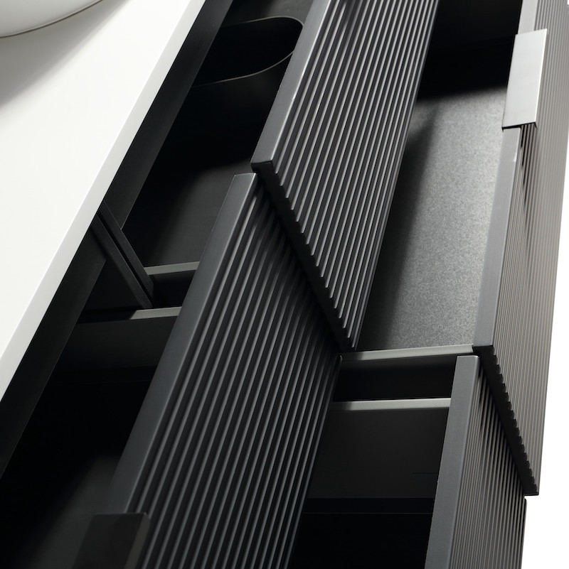 De geribbelde voorkant van deze kast heet 'canneled pattern', een ultratrendy reliëfpatroon dat nu ook verkrijgbaar is op badkamermeubels, tot grote vreugde van decoratieliefhebbers. Met zijn antracietgrijze (bijna zwarte) voorkant, versierd met horizontale groefpatronen, vertoont deze kast een eenvoudig en rechtlijnig design.