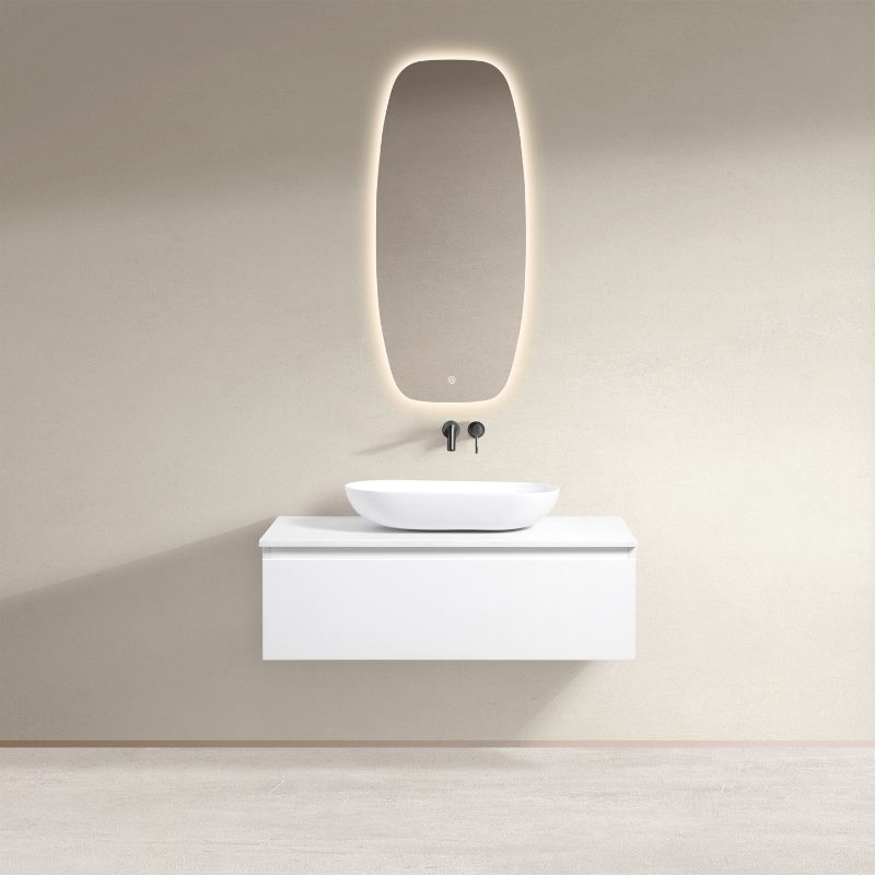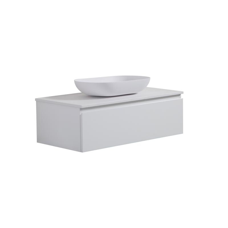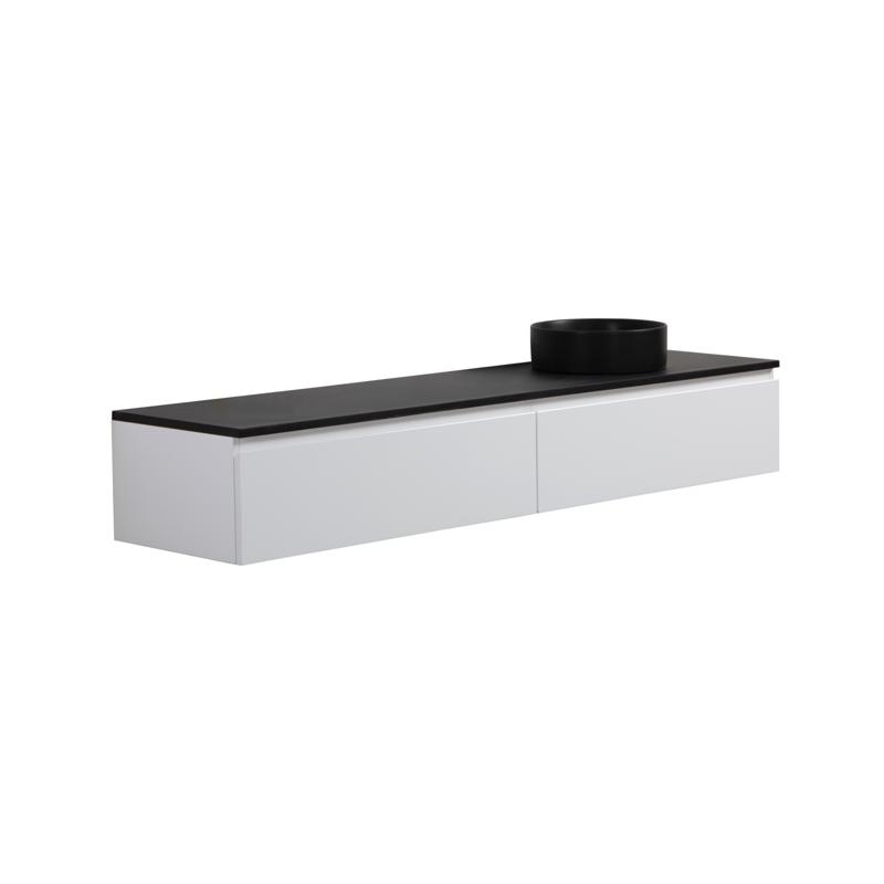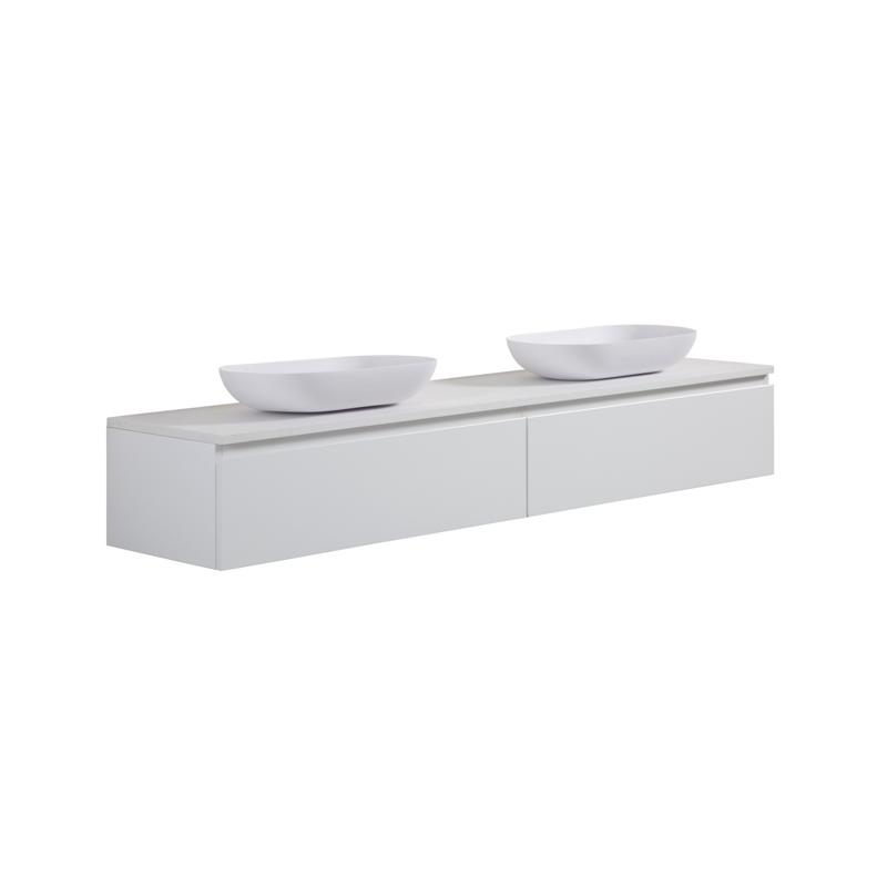 Het Shea badkamermeubel met werkblad combineert modern design met functionaliteit. Het wordt ongeboord geleverd en biedt ruimte voor één of twee wastafels en kranen naar keuze.