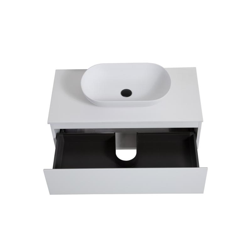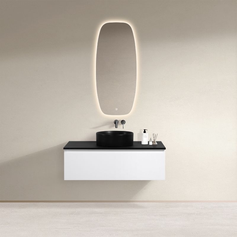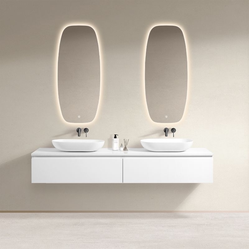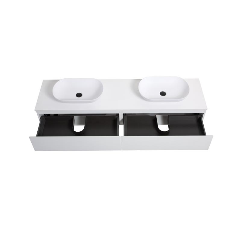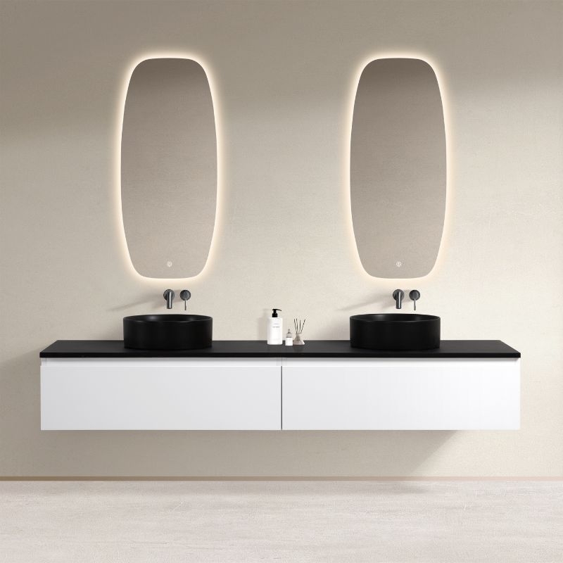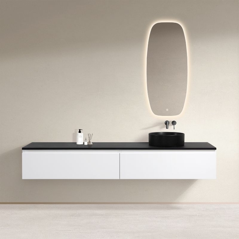 Het matwitte of matzwarte wastafelblad is ongeboord, waardoor u volledige ontwerpvrijheid heeft. U kiest zelf het type kraan (standaard of wandmengkraan), het aantal waskommen en de plaatsing ervan. Voor een model van 180 cm kunt u kiezen voor een enkele opzetwaskom of twee opzetwaskommen, afhankelijk van uw wensen. Boren is eenvoudig met een gatenzaag voor een perfect gepersonaliseerde afwerking.
