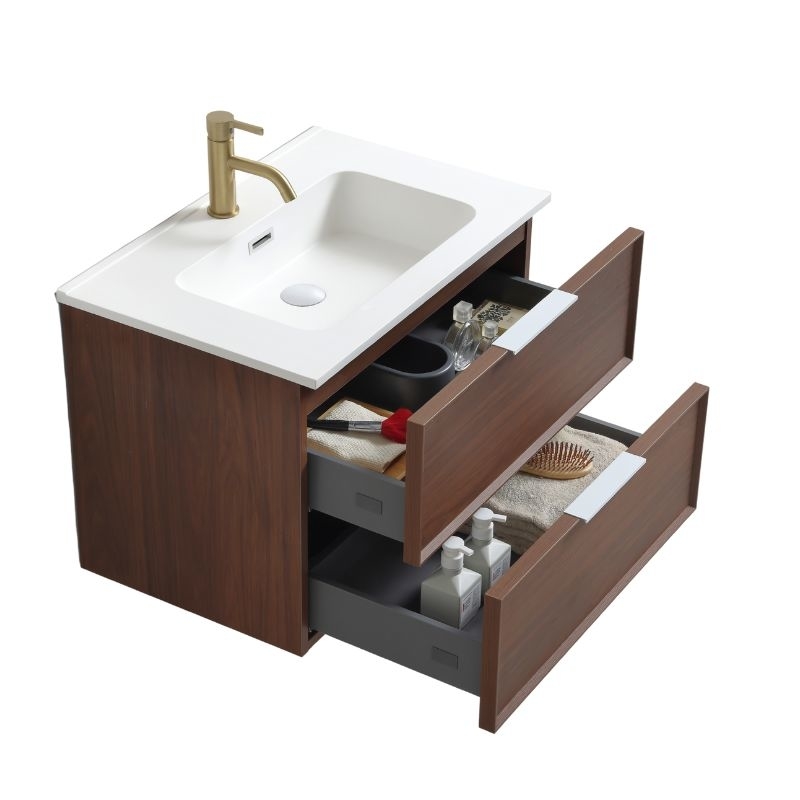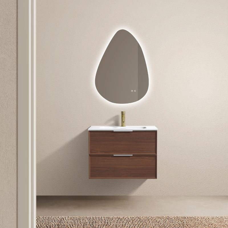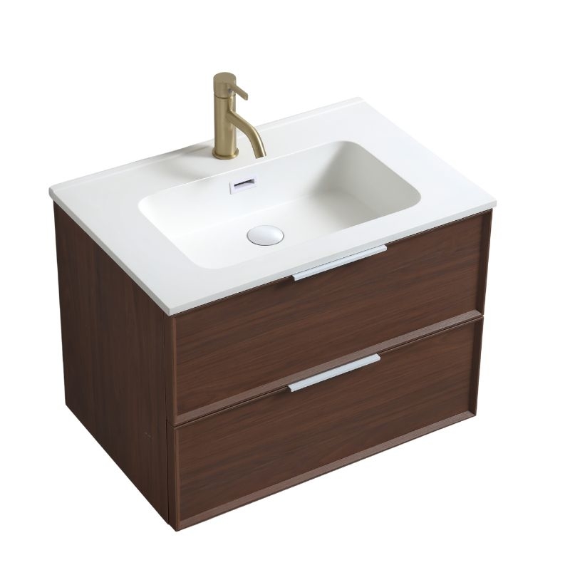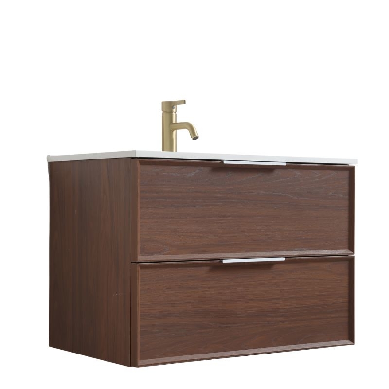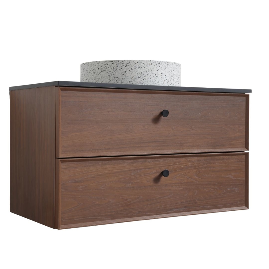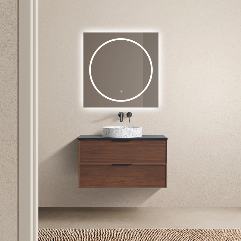 De Borda Petit wandunit, verkrijgbaar in 70 of 90 cm, combineert een realistische walnotenhouten look, praktische opbergruimte en hoogwaardige afwerking voor een moderne en uitnodigende badkamer.