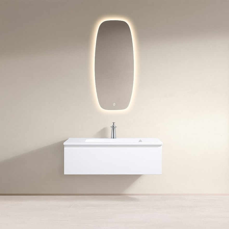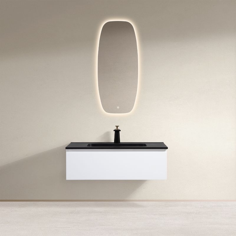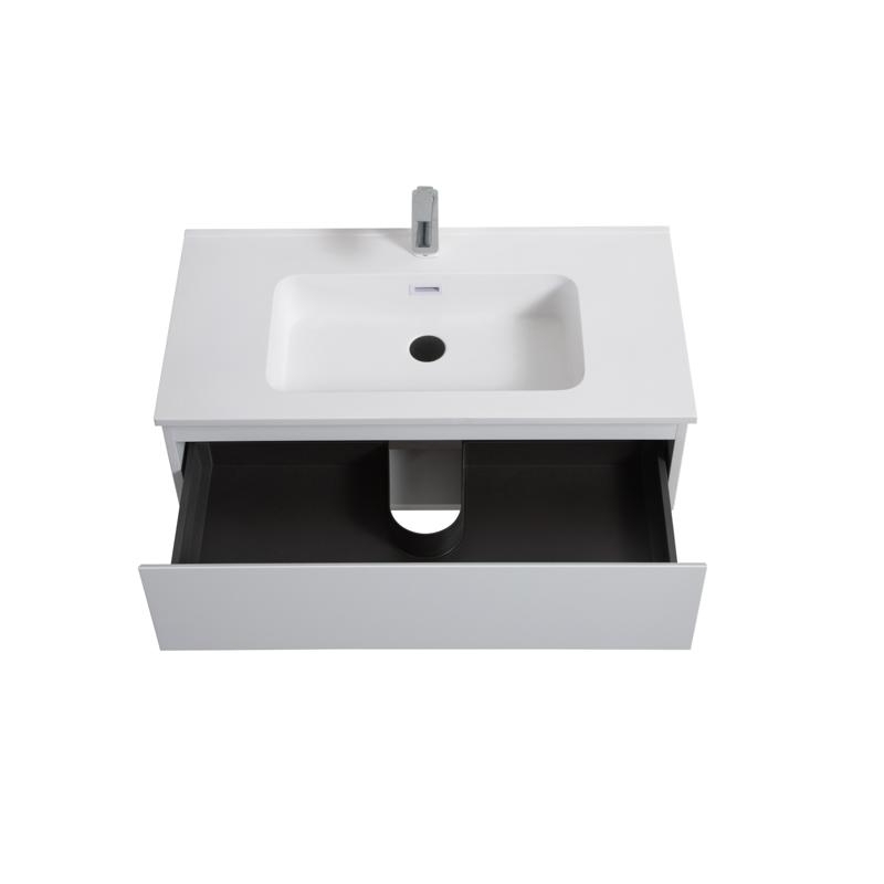 Ontdek de Shea badkamerkast in MDF met hoge dichtheid, met antibacteriële harswastafel, softclose lade en minimalistisch design.