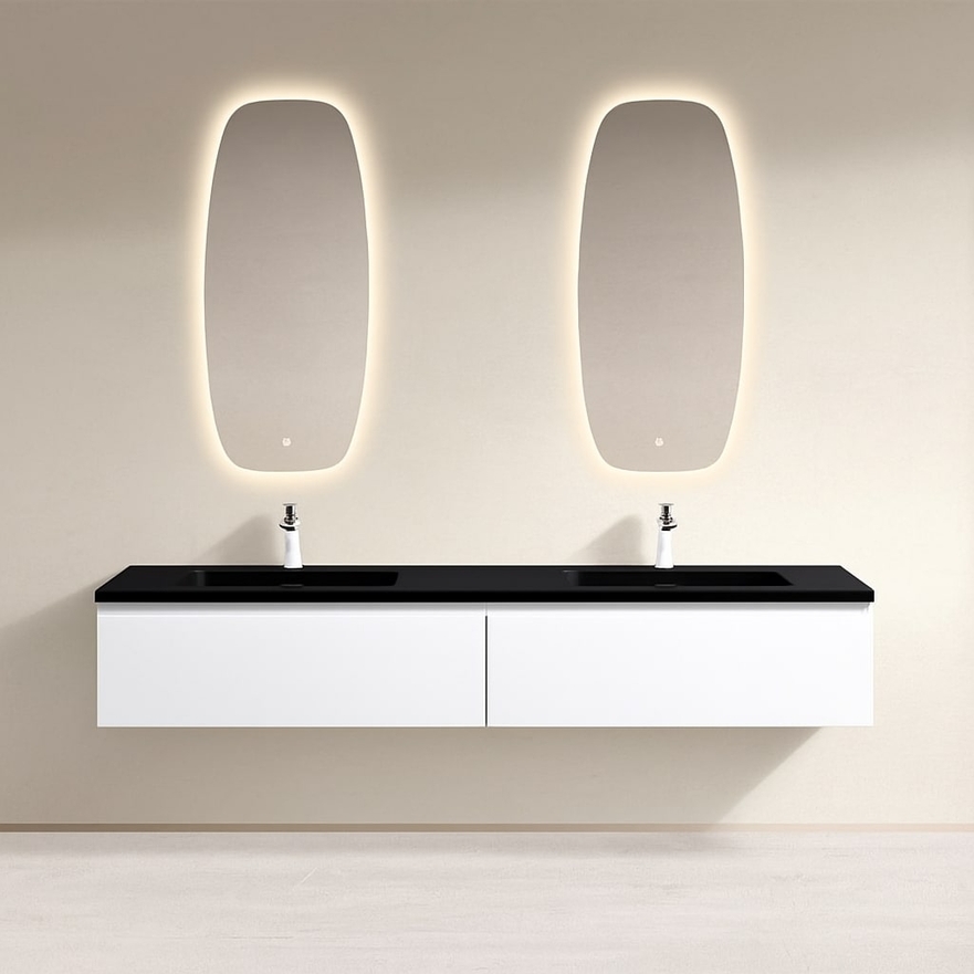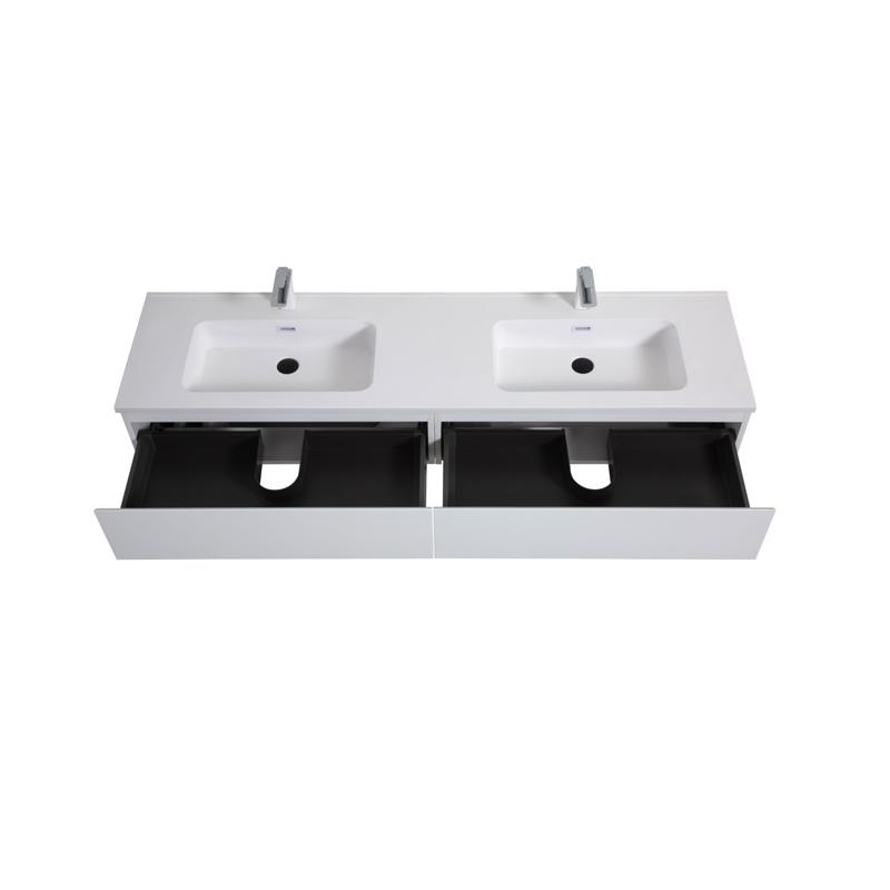 De Shea wastafelmeubel is voorzien van een hoogwaardige harswastafel, beschermd door een antibacteriële gelcoat. Hij is verkrijgbaar in drie elegante afwerkingen: glanzend wit, mat wit of mat zwart.