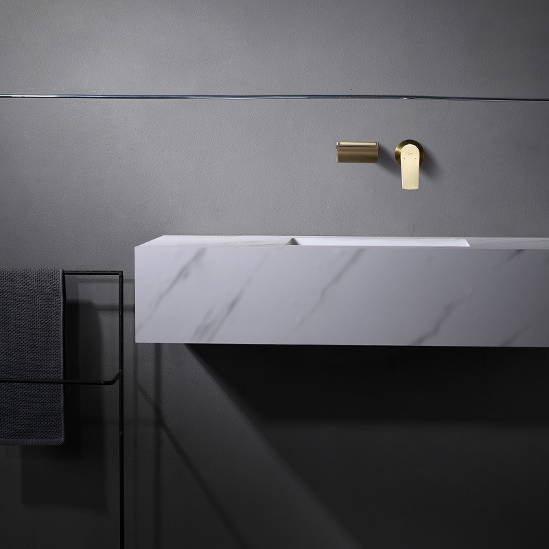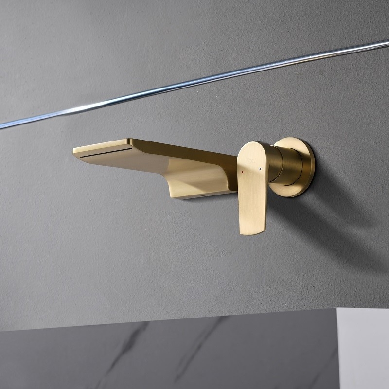De Cascade wandgemonteerde wastafelkraan combineert een strakke watervaluitloop met een ingebouwd design. Verkrijgbaar in glanzend chroom, matzwart (gegalvaniseerd) en geborsteld goud (PVD) en gemaakt van massief messing. De 5 cm dikke kunststof behuizing vergemakkelijkt de installatie, optimaliseert de ruimte en garandeert duurzaamheid.