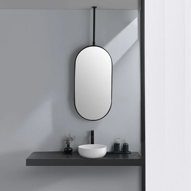 De installatie is eenvoudig: schroef de spiegel op de metalen stang en bevestig hem aan het plafond. Transformeer je badkamer met de Psyche spiegel die aan het plafond hangt.