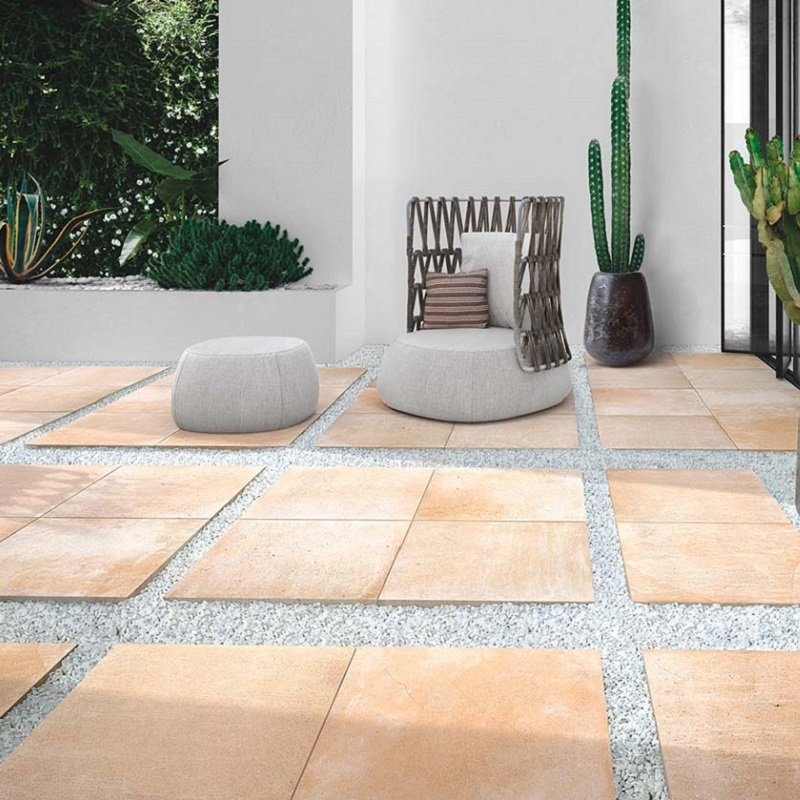 Kies voor kwalitatieve Italiaanse tegels voor uw terras op percelen met deze Pietra Baugè 2 cm porseleinen steengoed tegels .