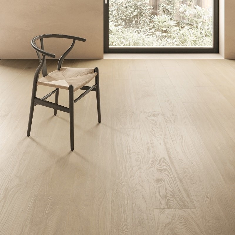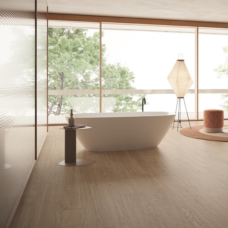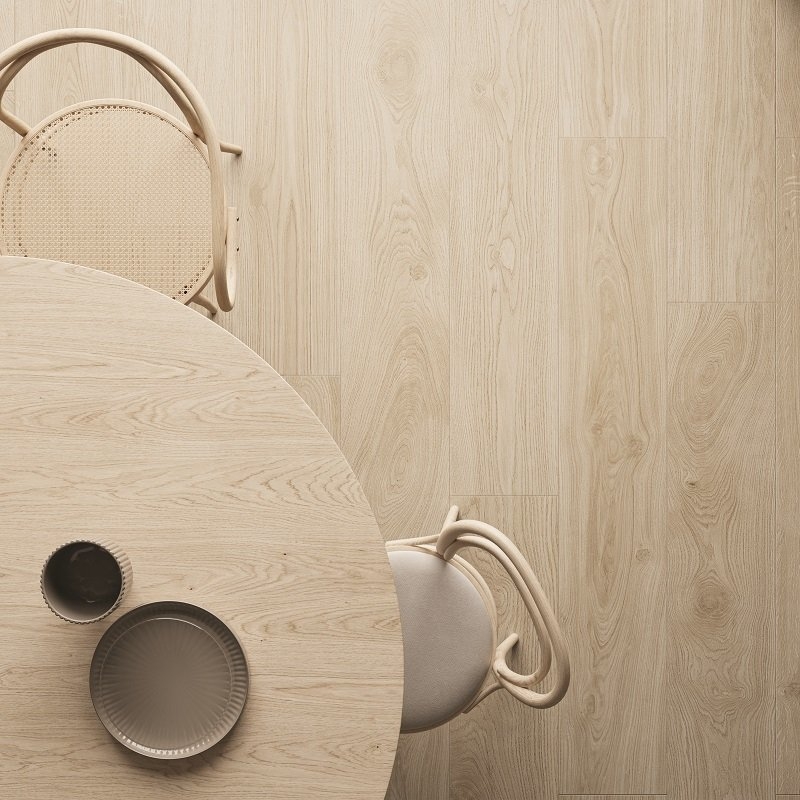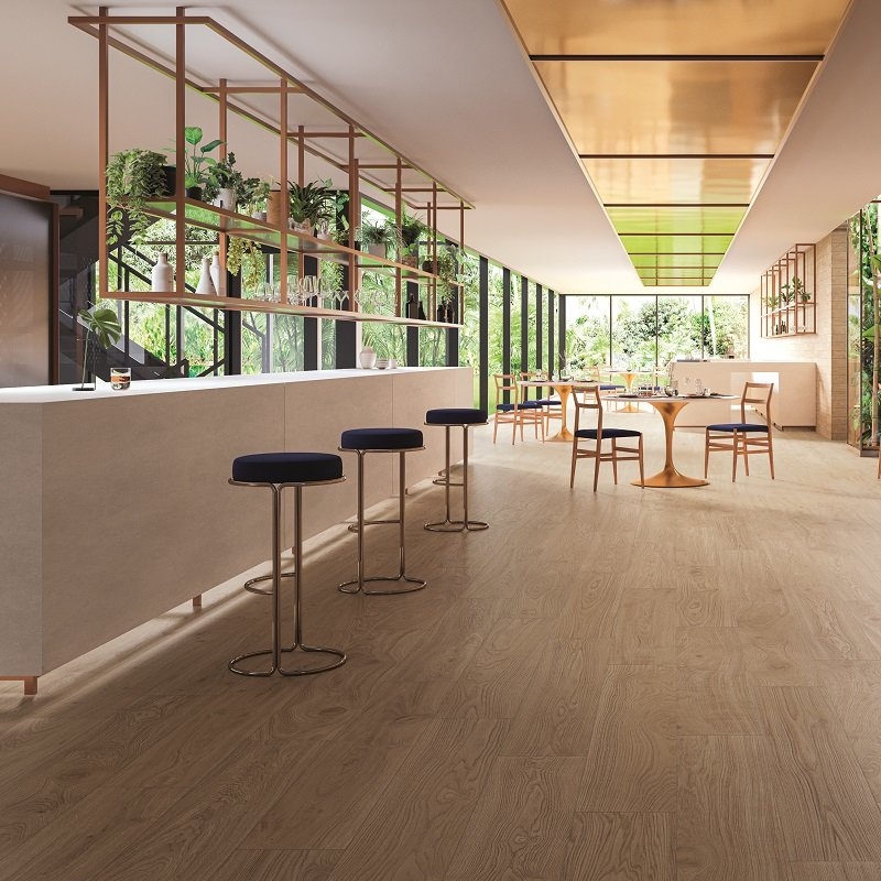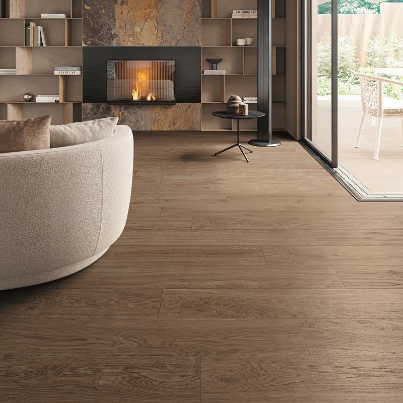 Aarzel niet om de Mimesis tegels met natuurlijk houteffect te combineren met de gelijknamige plinten. Zo maak je je interieur perfect af en verberg je de lage ruimtes in de muur.
