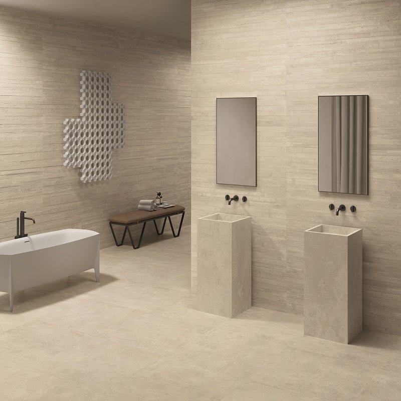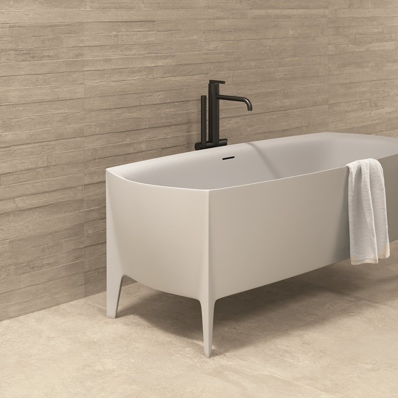 De gladde tegelcollectie Stray Wood bekisting met steeneffect is een uitzonderlijke collectie die het ruwe bekistingshout van gewassen beton perfect imiteert. Dankzij de grote formaten (80 x 160 cm en 60 x 120 cm) en de formaten in een gladde uitvoering creëert u een natuurlijke sfeer. Zo kunt u een gladde vloer (Stray Wood) en een grote muurachtergrond combineren met Stray Wood 3D-bekisting in uw badkamer.