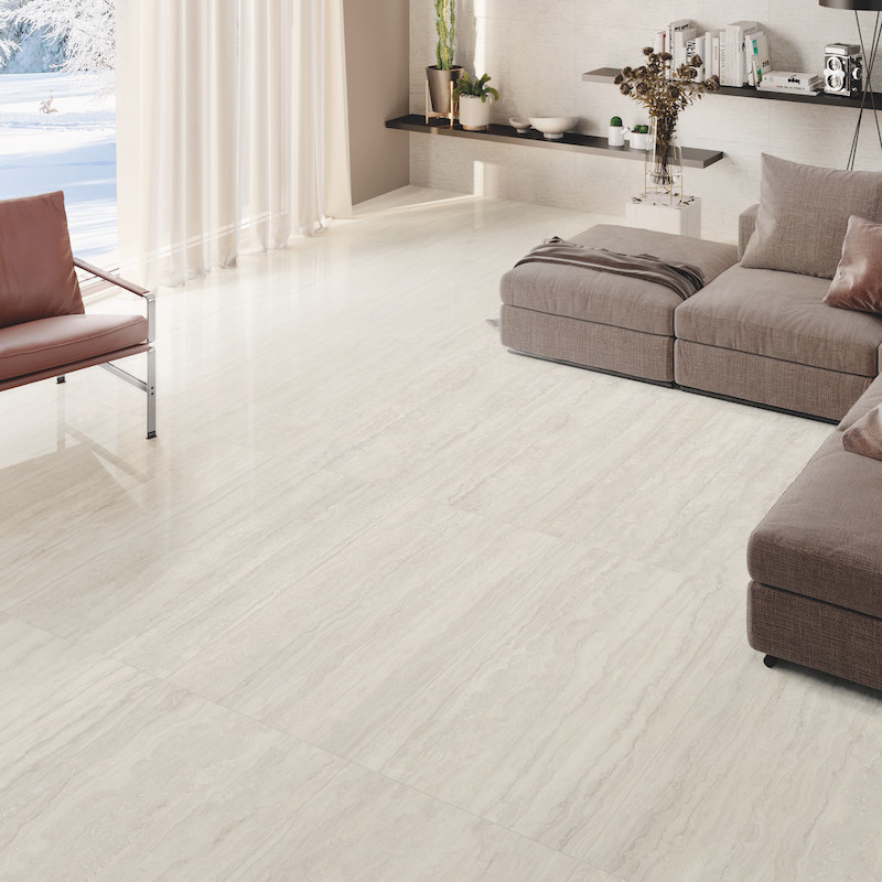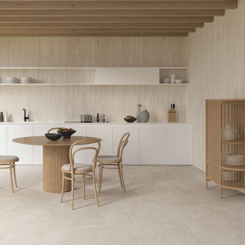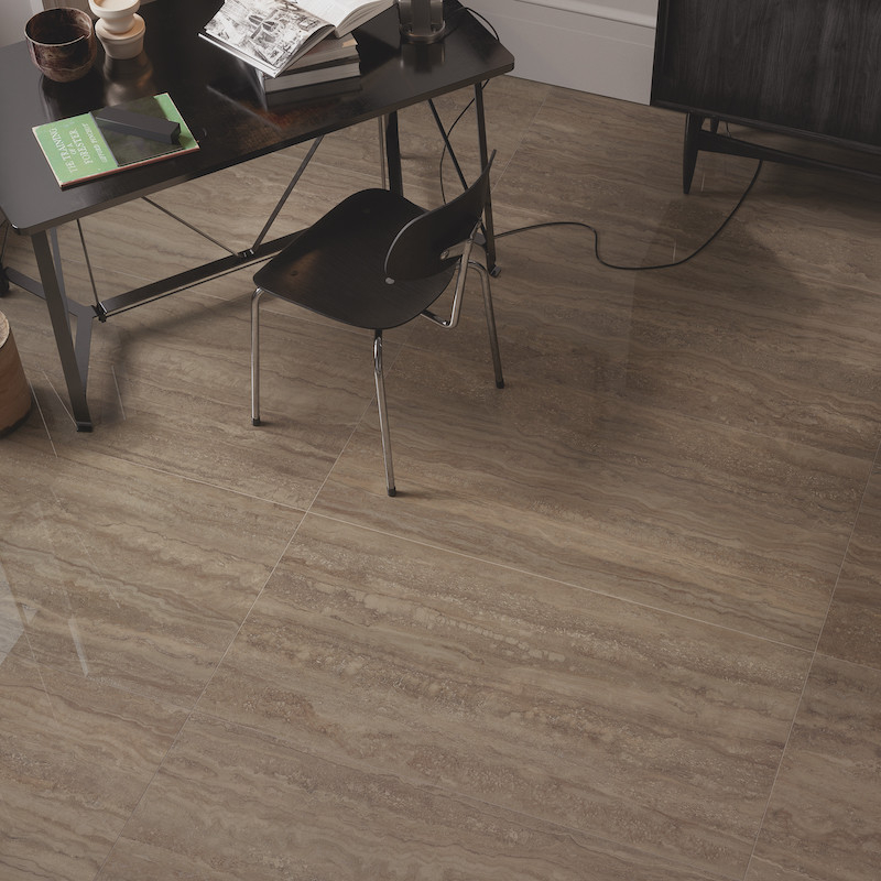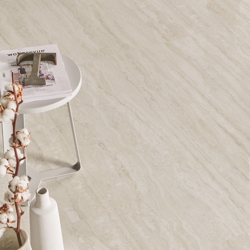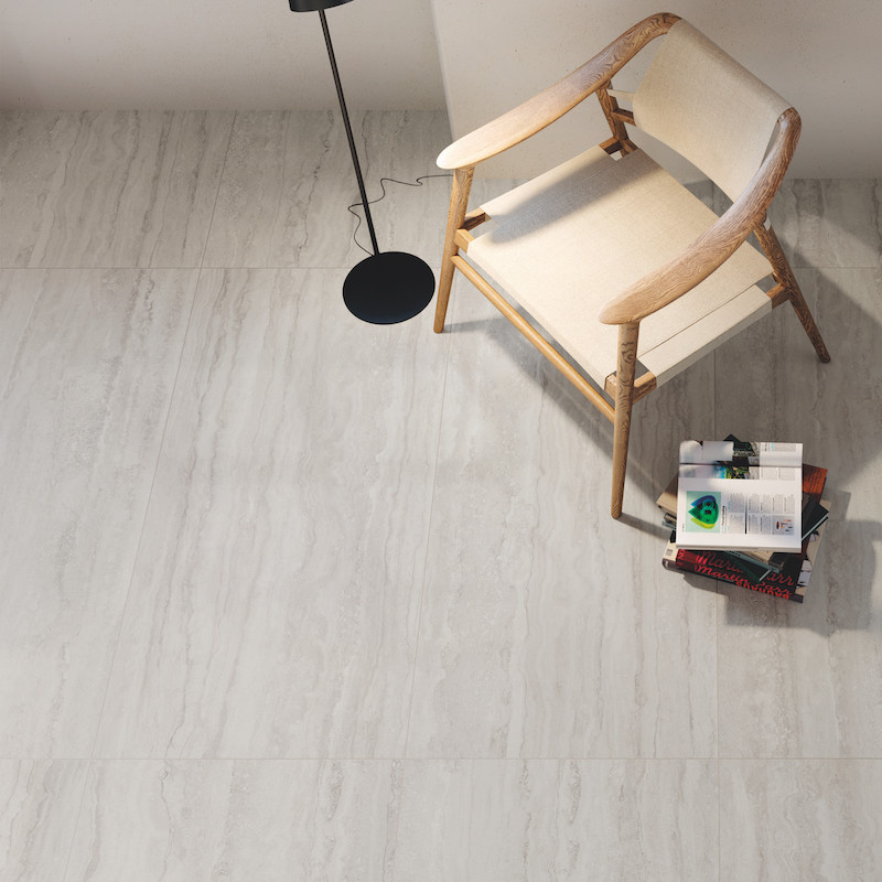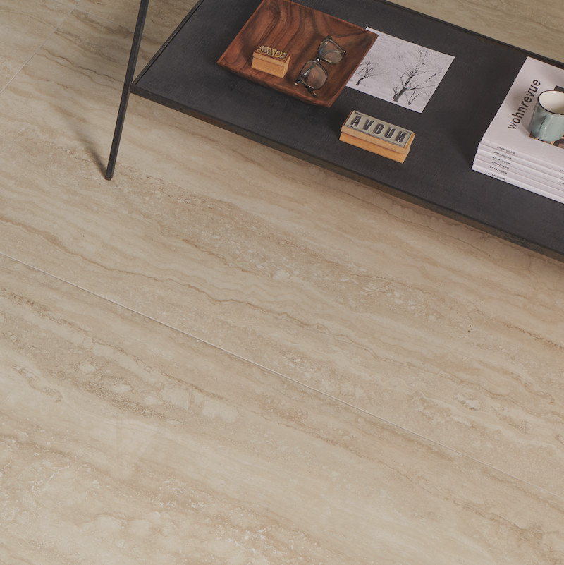 Deze tegel met travertijneffect heeft een look die meer doet denken aan kalksteen. Hij is al eeuwenlang populair en maakt vandaag de dag een comeback in de wereld van decoratie.