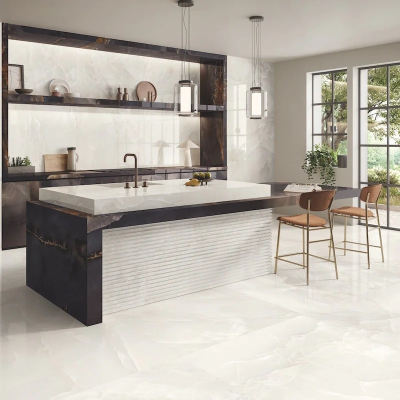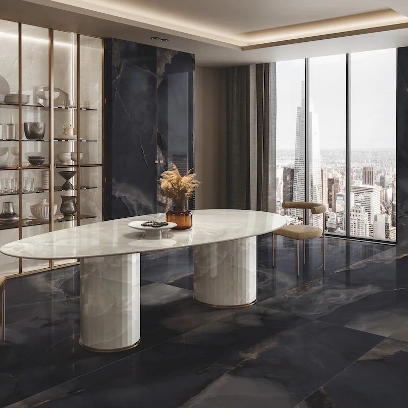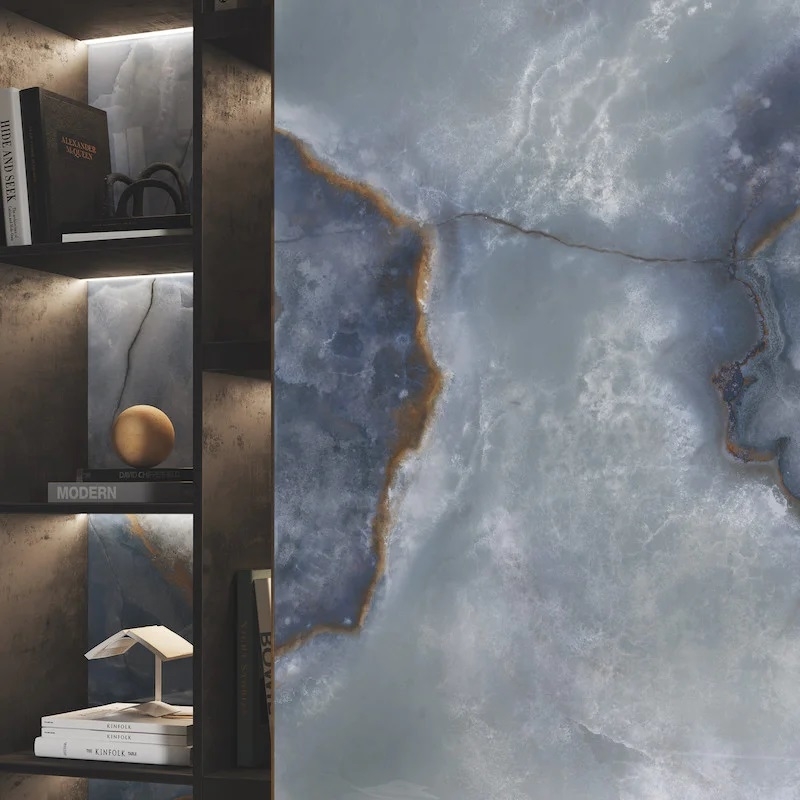 Dankzij hun grote formaat en geringe dikte creëren Tele di Marmo Onyx XXL-platen doorlopende en homogene oppervlakken, waardoor het ruimtegevoel wordt versterkt en voegen tot een minimum worden beperkt. De ultraglanzende Lappato-afwerking creëert een opvallend spiegeleffect en benadrukt de diepe aderen en het karakteristieke lichtspel van onyx.