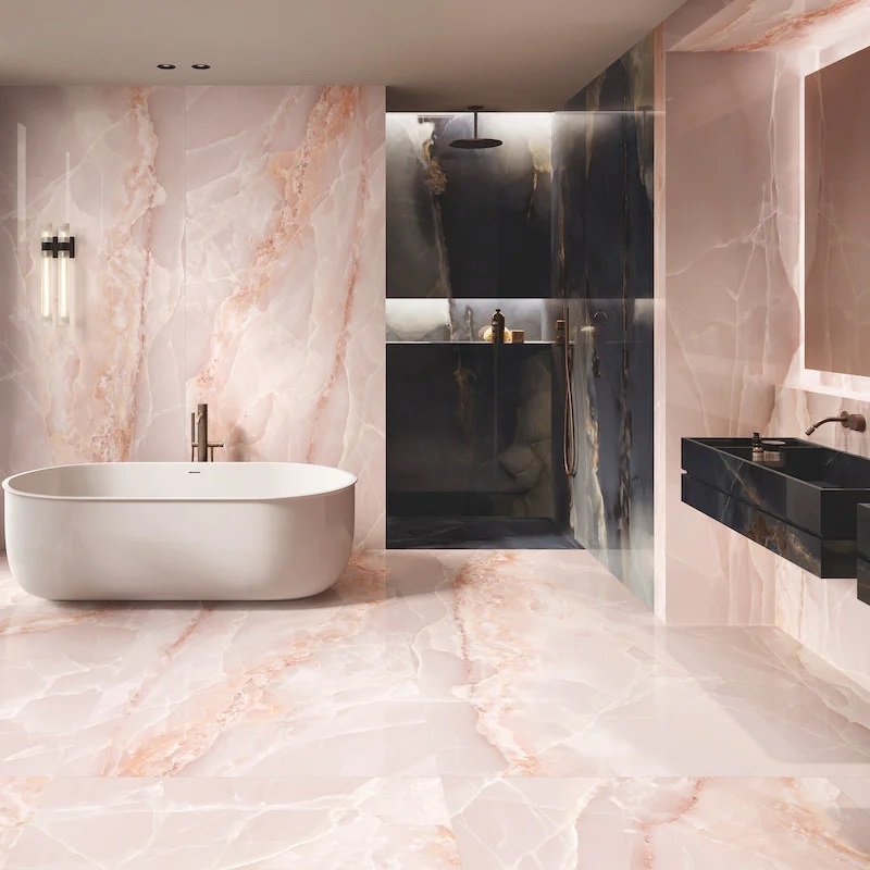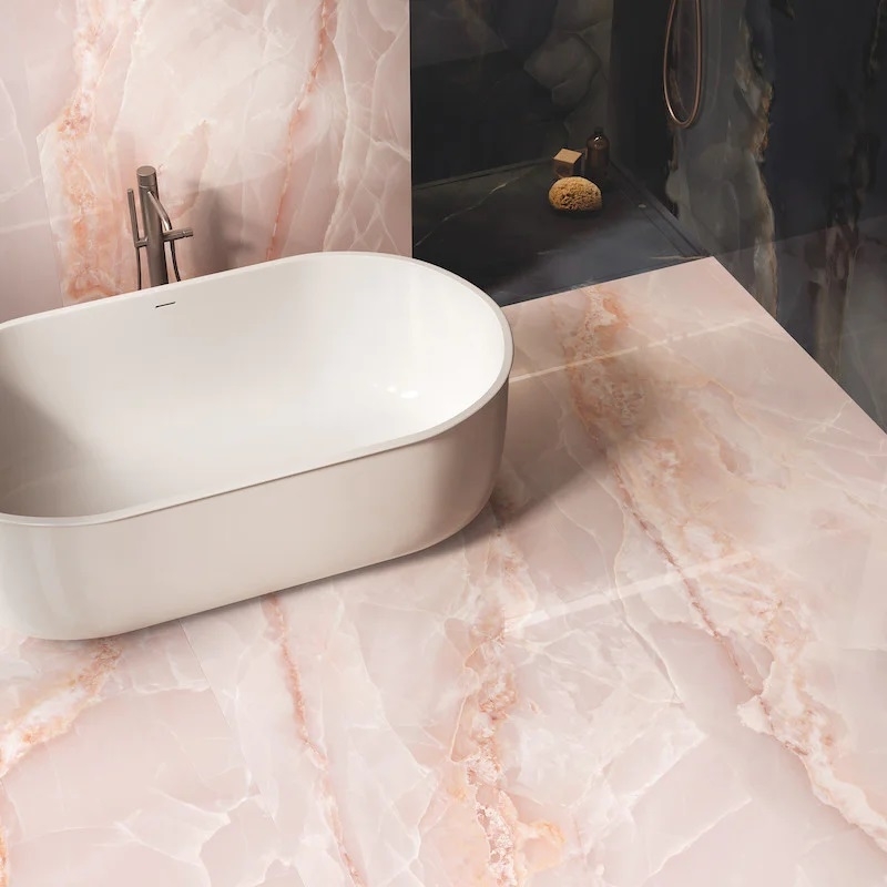 Deze grootformaat tegels zijn perfect voor wand- of vloerbekleding en brengen een vleugje elegantie en design in uw interieur. Transformeer uw woonkamer of badkamer in uitzonderlijke ruimtes met de Tele di Marmo Onyx XXL-collectie, een perfecte mix van luxueuze esthetiek en technische prestaties.