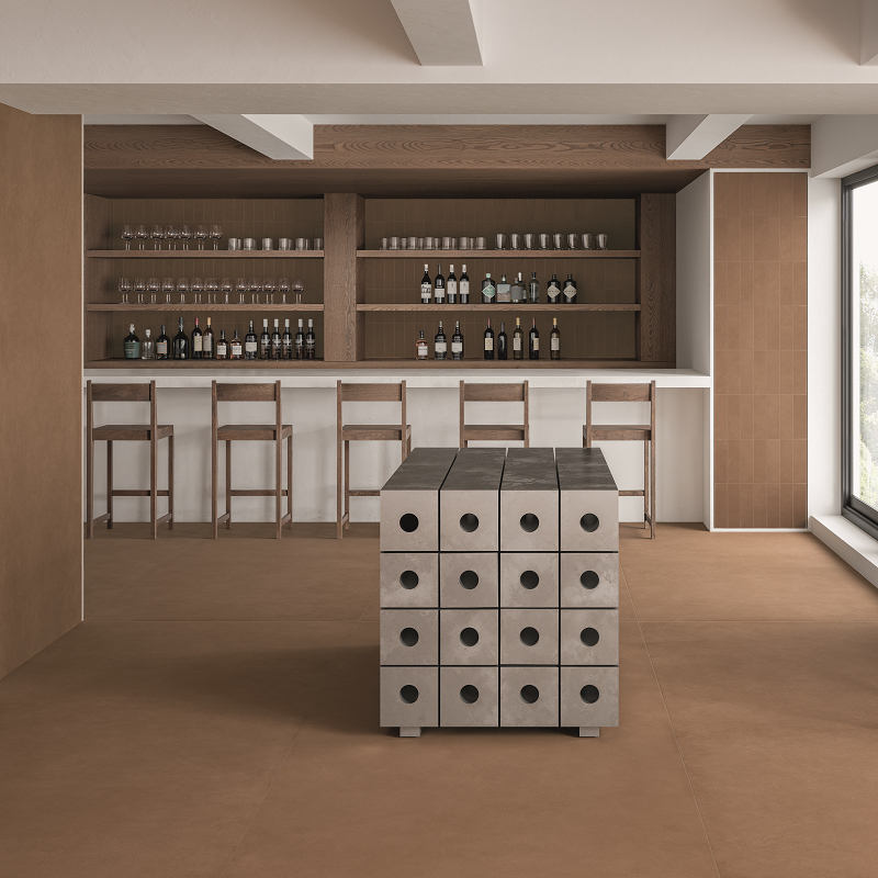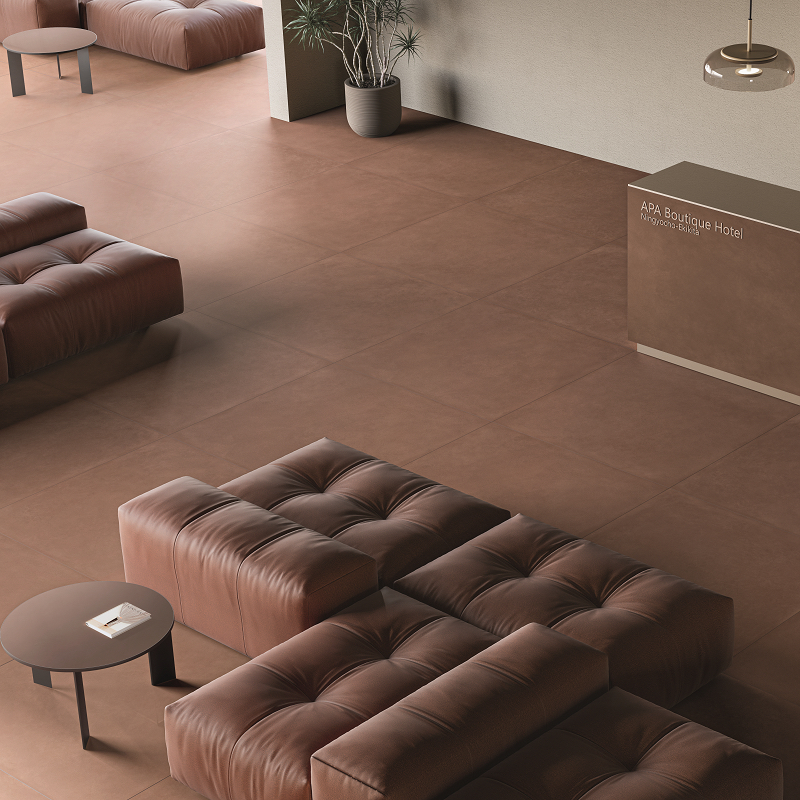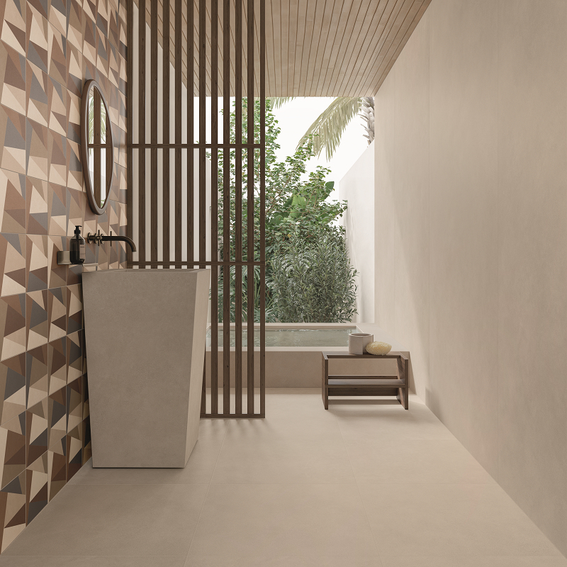 De Terrae XXL-collectie herdefinieert de ruimte met zijn grote tegels van 120 x 278 cm. Deze minerale vlakken, met hun warme natuurlijke kleuren en matte afwerking, creëren visuele continuïteit en een serene sfeer.