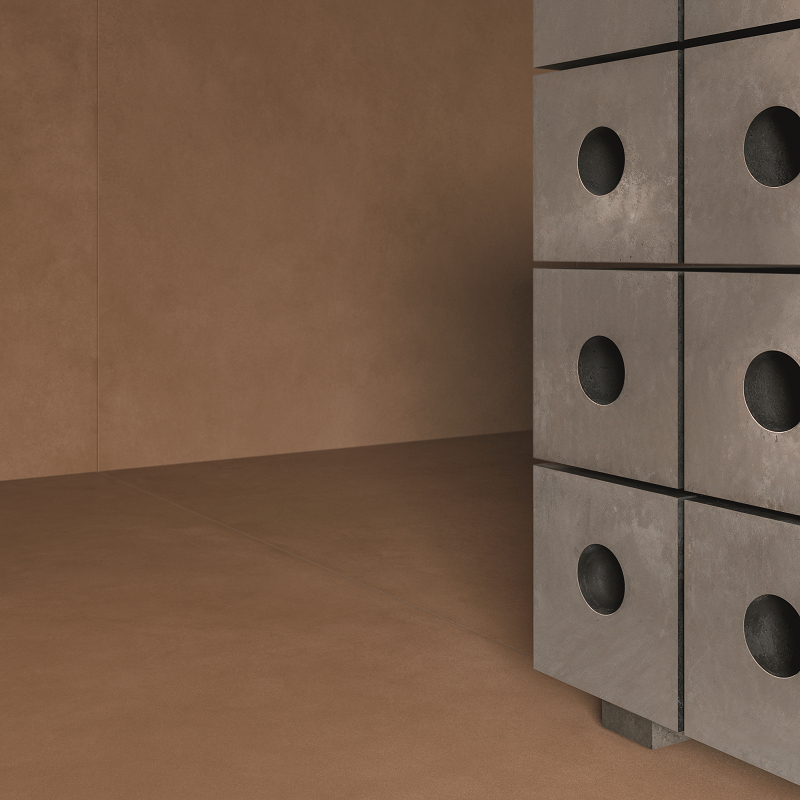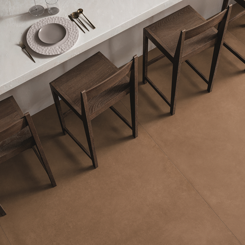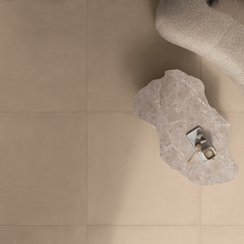 De afwezigheid van zichtbare voegen versterkt het gevoel van ruimte en continuïteit en creëert een serene en omhullende sfeer. De matte afwerking, die zacht aanvoelt, benadrukt de subtiele nuances en variaties en roept de rauwe schoonheid van de aarde op.