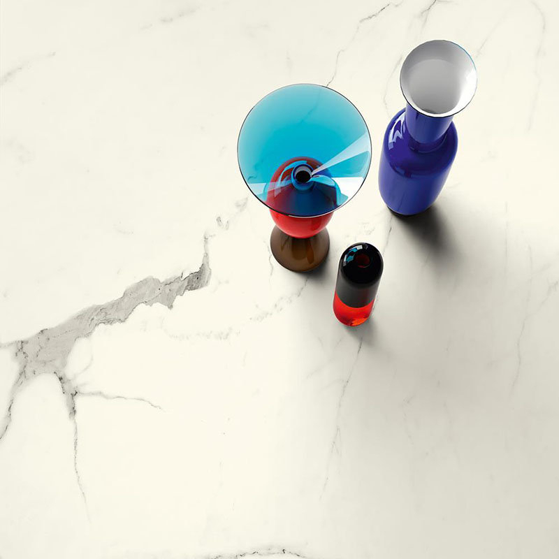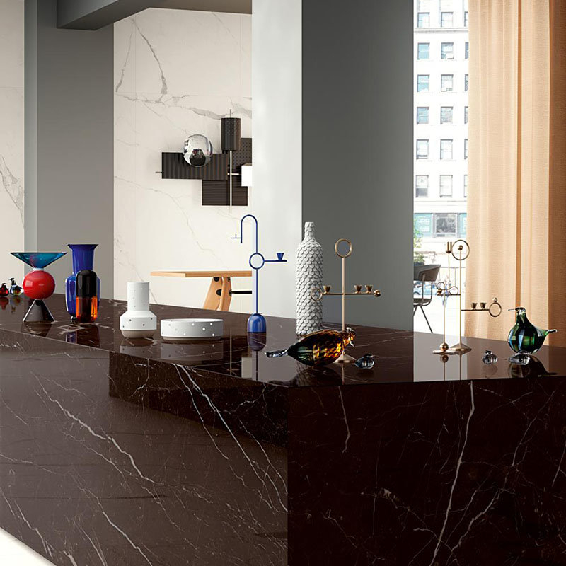 Vanity XXL is geïnspireerd op het fijnste klassieke marmer en biedt verfijnde, grote oppervlakken. De platen verfraaien elke ruimte met de elegantie van delicate aders en subtiele lichtcontrasten.