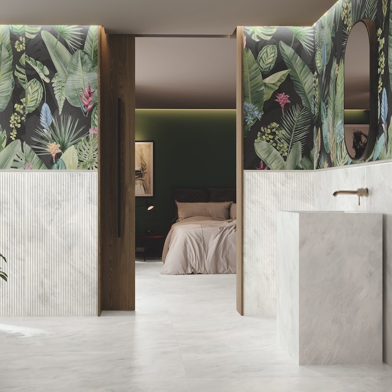 De Kinfolk Black Mix tegel biedt duurzaamheid en verfijning met zijn bloemenpatroon op een zwarte achtergrond. De Carving-techniek zorgt voor een luxueus glanzend effect, wat inspireert tot een "slow life" in de Kinfolk stijl en de natuurlijke schoonheid ervan benadrukt.