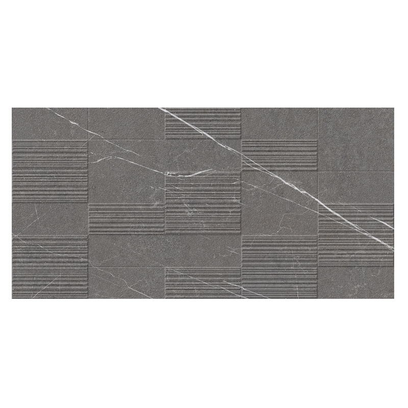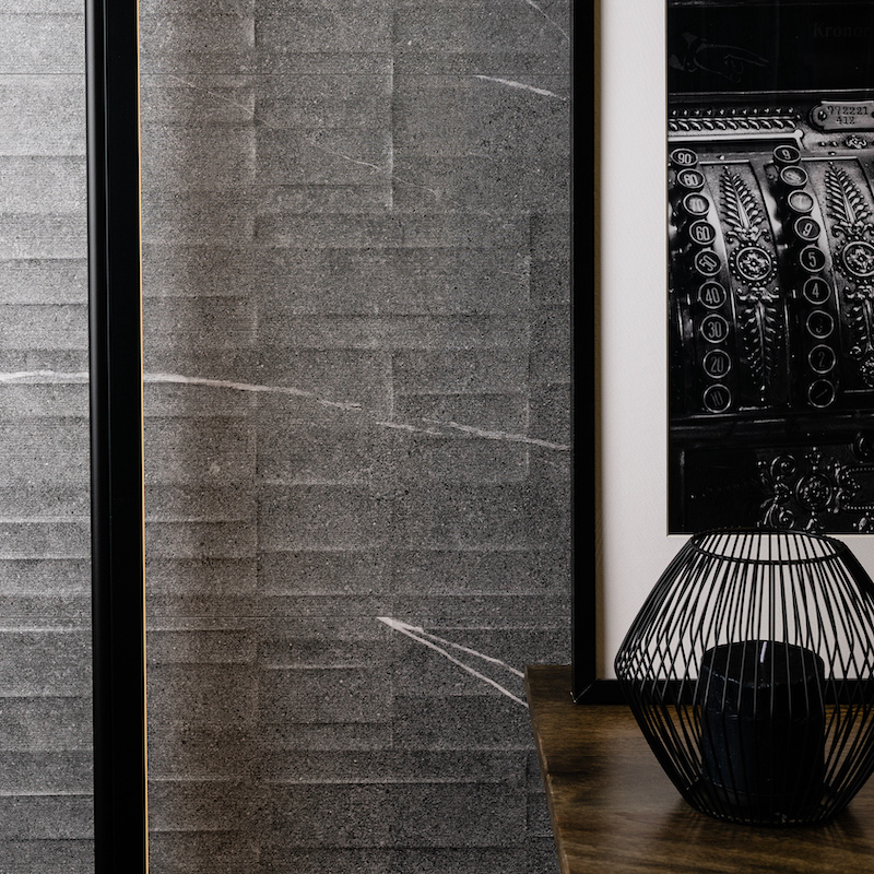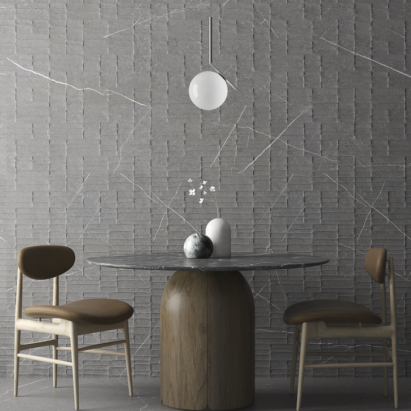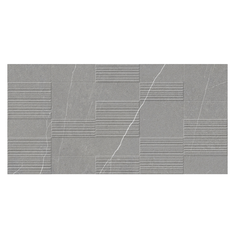 Verkrijgbaar in drie minerale kleuren – crème, grijs en donker – maakt het indruk met zijn authentieke steenlook en getextureerde matte oppervlak. Elke plaat heeft een horizontaal reliëf in onregelmatige banden, alsof ze in de steen zijn gehouwen, voor een zacht en natuurlijk grafisch effect.