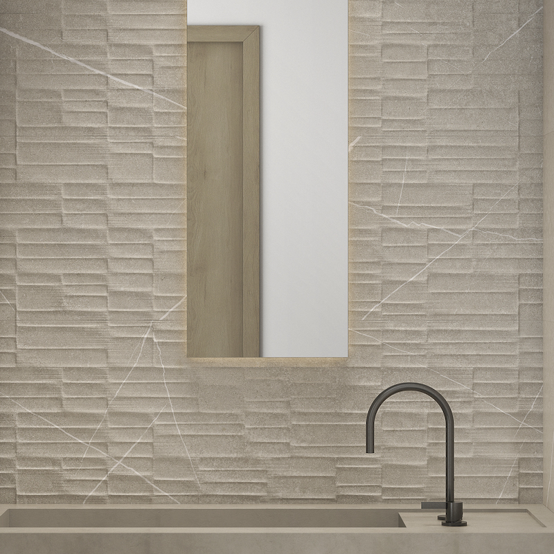 De matte afwerking versterkt de rauwe elegantie van het materiaal. Dankzij de geslepen randen verloopt de installatie met fijne voegen voor een strakke en nette afwerking. Ideaal voor een badkamer, keuken of accentmuur: Capri Relief speelt met contrasterend licht voor een warme en minerale sfeer.