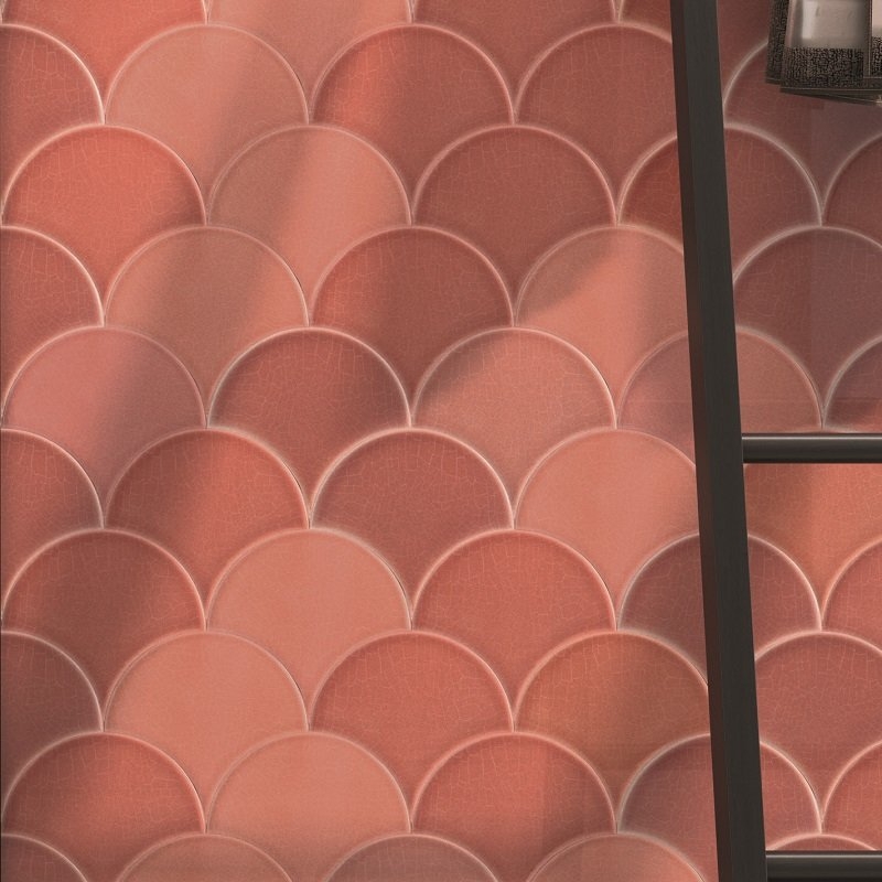 De Escamas retro wandtegel heeft een halvemaan- of zonsondergangmotief met zeer fijne, lichte reliëfs. Een unieke en authentieke look voor uw designinterieur. Verkrijgbaar in 7,5 cm x 17 cm, verkleind tot 6 cm.
