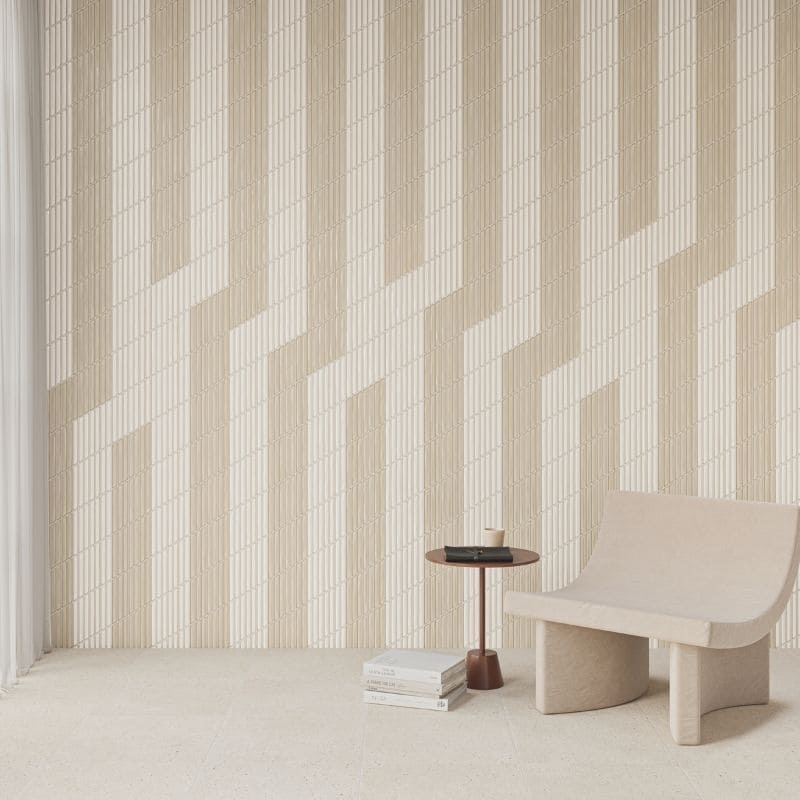 Verkrijgbaar in twee complementaire patronen en 9 zorgvuldig geselecteerde kleuren: Talk Mat, Earth Mat, Deep White Gloss, Greige Gloss, Mineral Grey Gloss, Fern Gloss, Peacock Blue Gloss, Ebony en Royal Green Gloss. Er zijn twee soorten afwerkingen: een zijdezachte matte afwerking, ideaal voor een zachte en natuurlijke sfeer, en een ultraglanzende afwerking die de kleuren intenser maakt en een verfijnd spiegeleffect creëert.