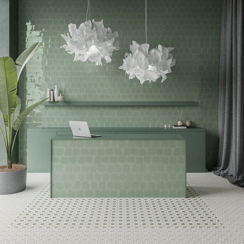 Deze Fayenza zellige-effecttegel is een klein juweeltje. Het oppervlak van de tegels is zeer glanzend, alsof het bedekt is met een ultraglanzende glazuurlaag. Het licht reflecteert op een unieke manier.