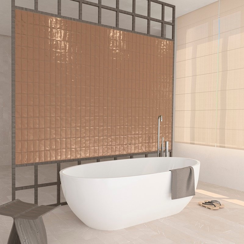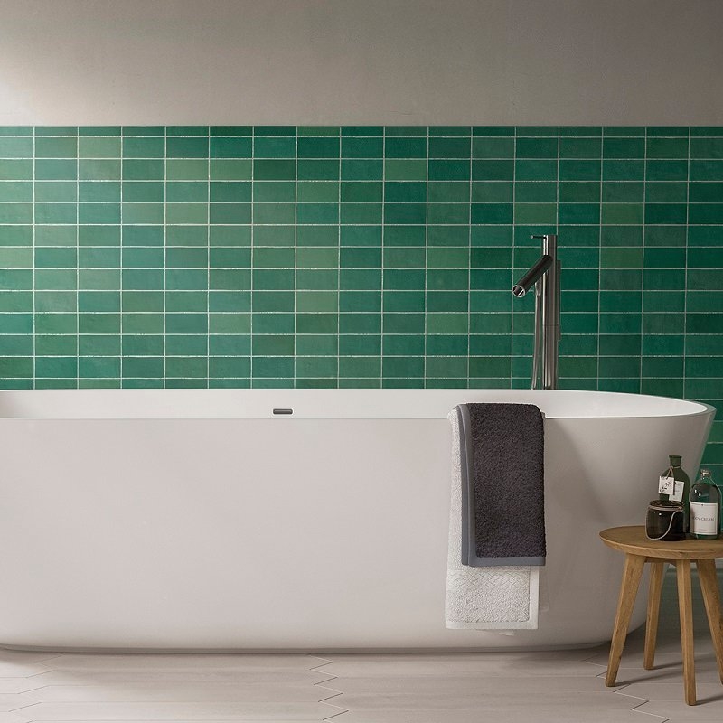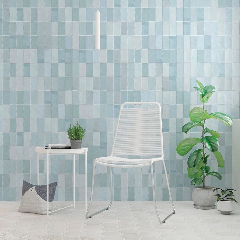De Fez zellige-effecttegel is verkrijgbaar in 11 kleuren, waaronder twee metallic effecten: koper en staal. En in twee afwerkingen: mat en glanzend. Elke zelligetegel is 6,2 x 12,5 cm groot.