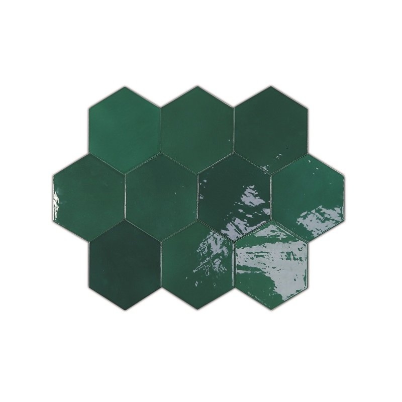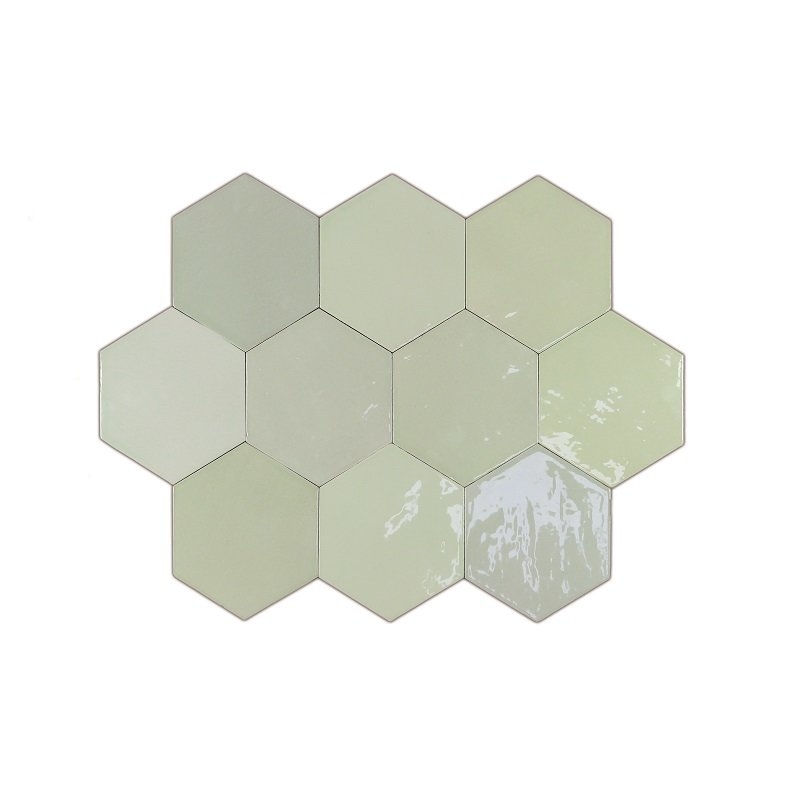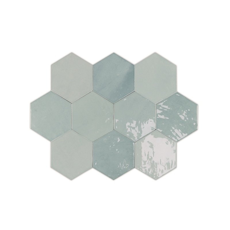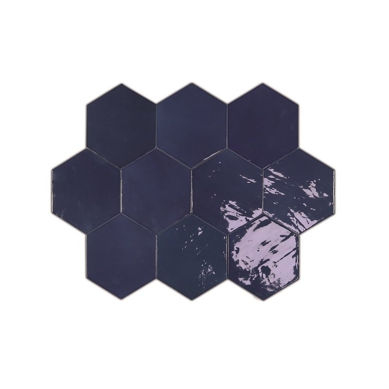 Zeshoekige tegel in Marokkaanse zelligestijl. Verkrijgbaar in 10 kleuren, variërend van pasteltinten tot intensere kleuren. Afmetingen: 10,8 cm x 12,4 cm, glanzende afwerking.
