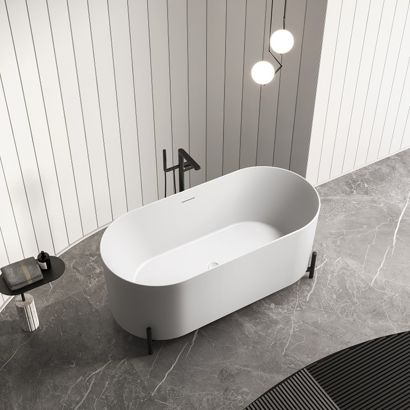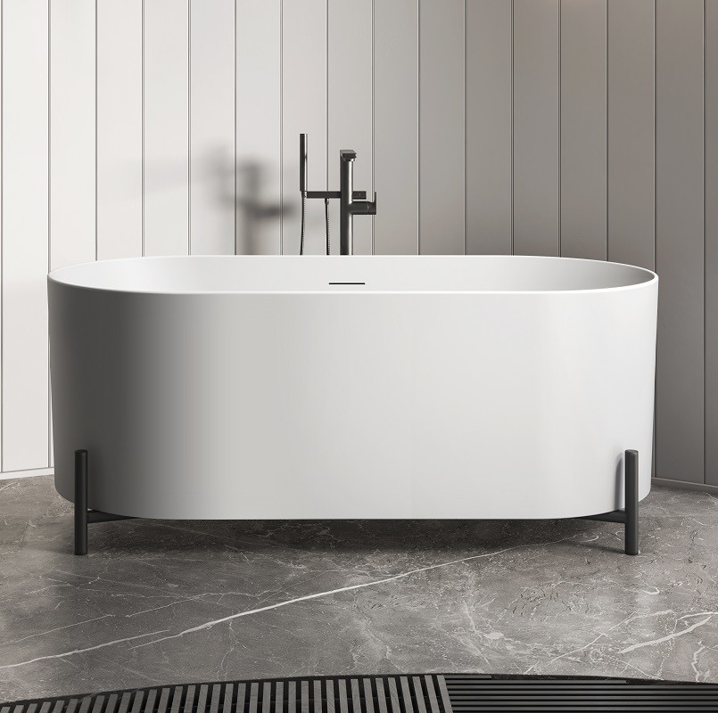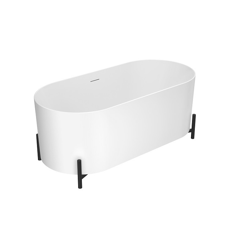 Découvrez "Elle" : une baignoire îlot blanche mat au design ovale de 160 cm, rehaussée par quatre pieds noirs mats en métal, offrant une interprétation moderne des baignoires îlot rétro.